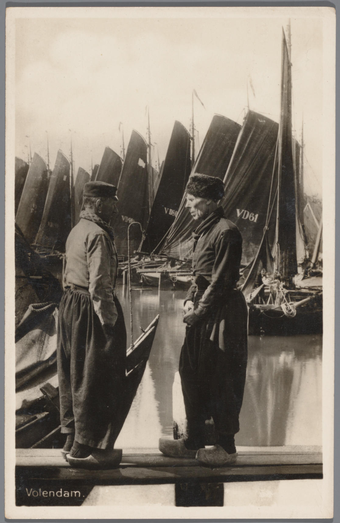 Twee mannen in Volendammer streekdracht bij de haven