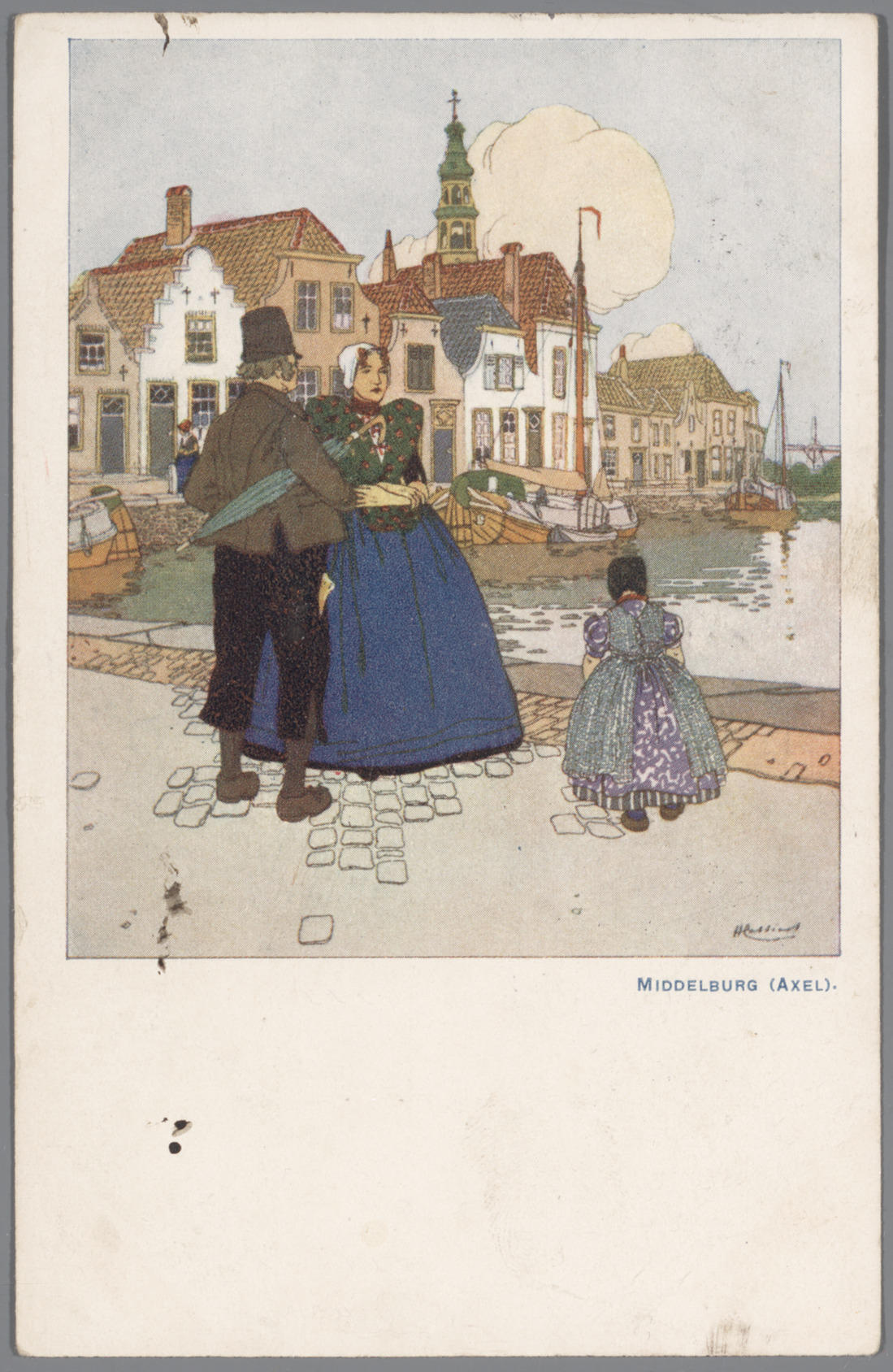 Man, vrouw en meisje in Axelse dracht, aan de haven ...