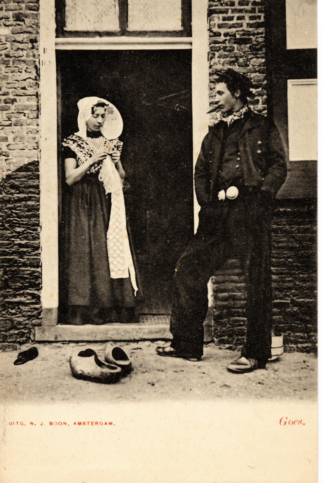 Vrouw en man in protestantse Zuid-Bevelandse dracht,...