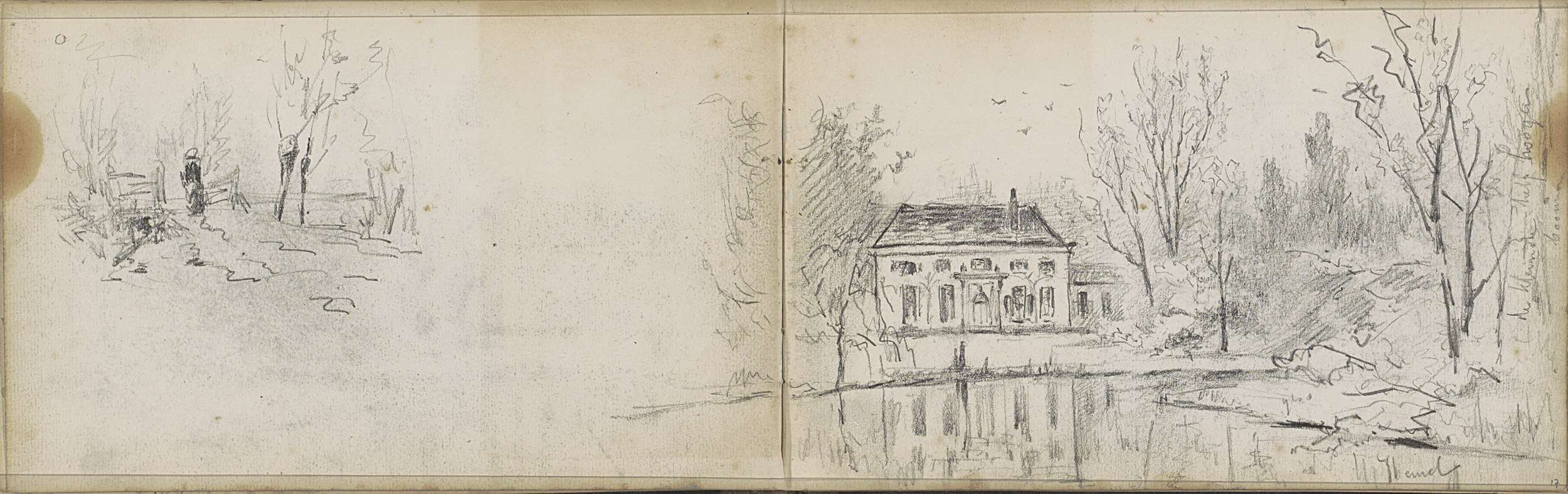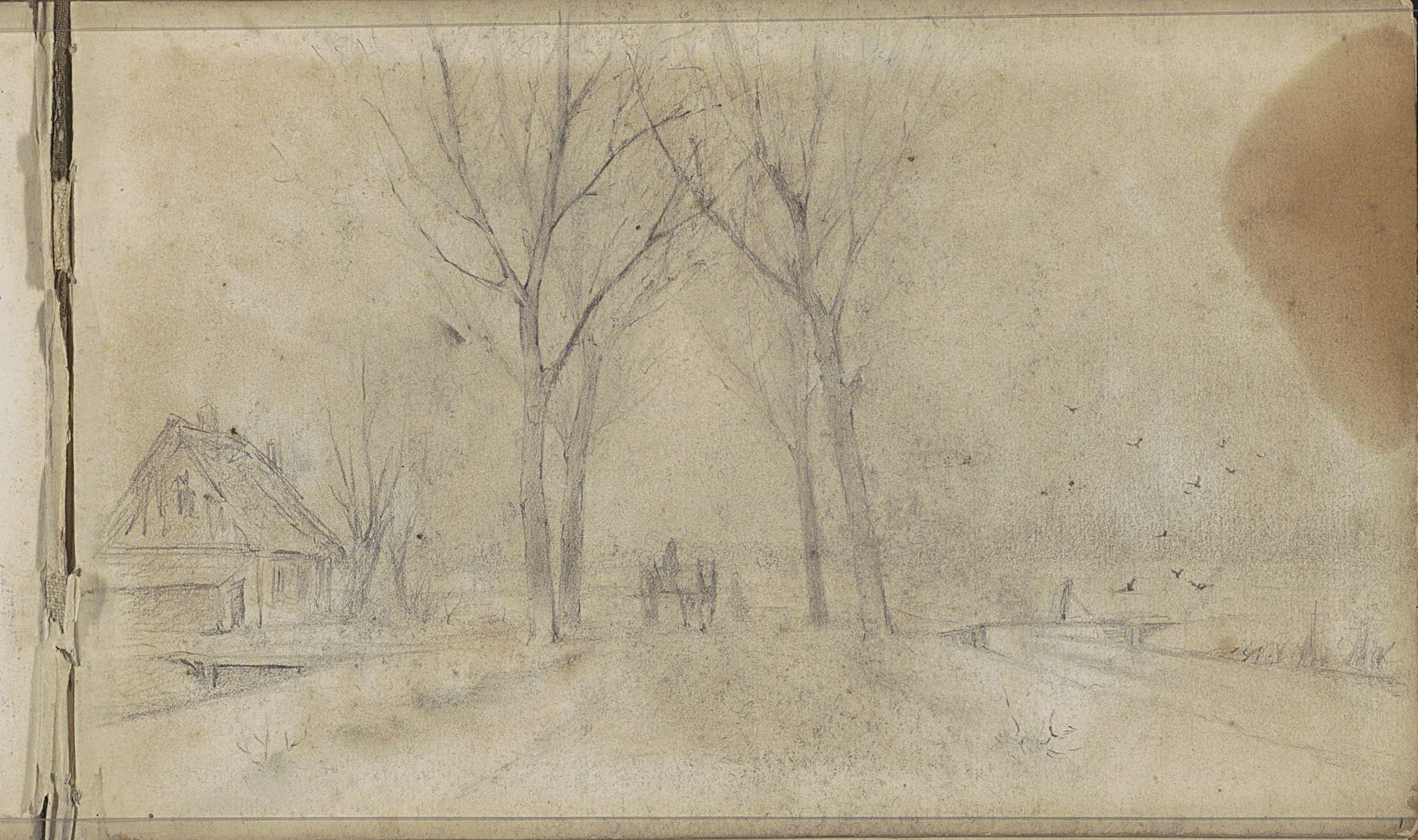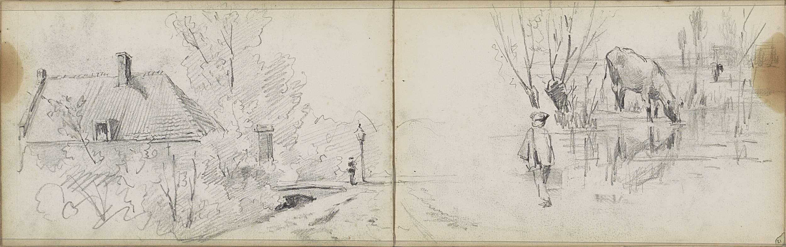 Boerderij langs een vaart, een huis en figuren met e...