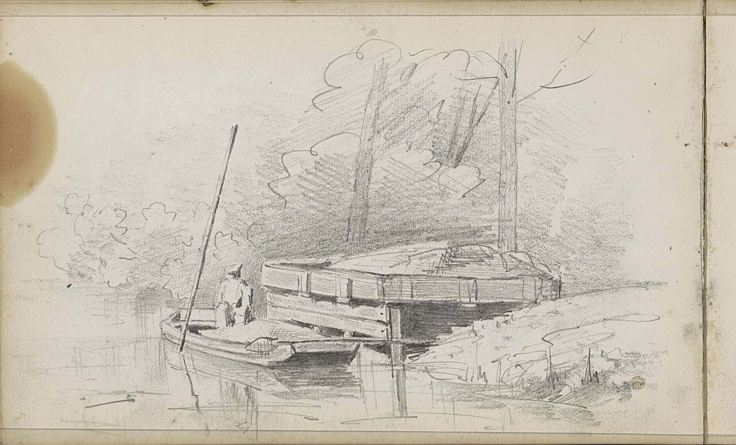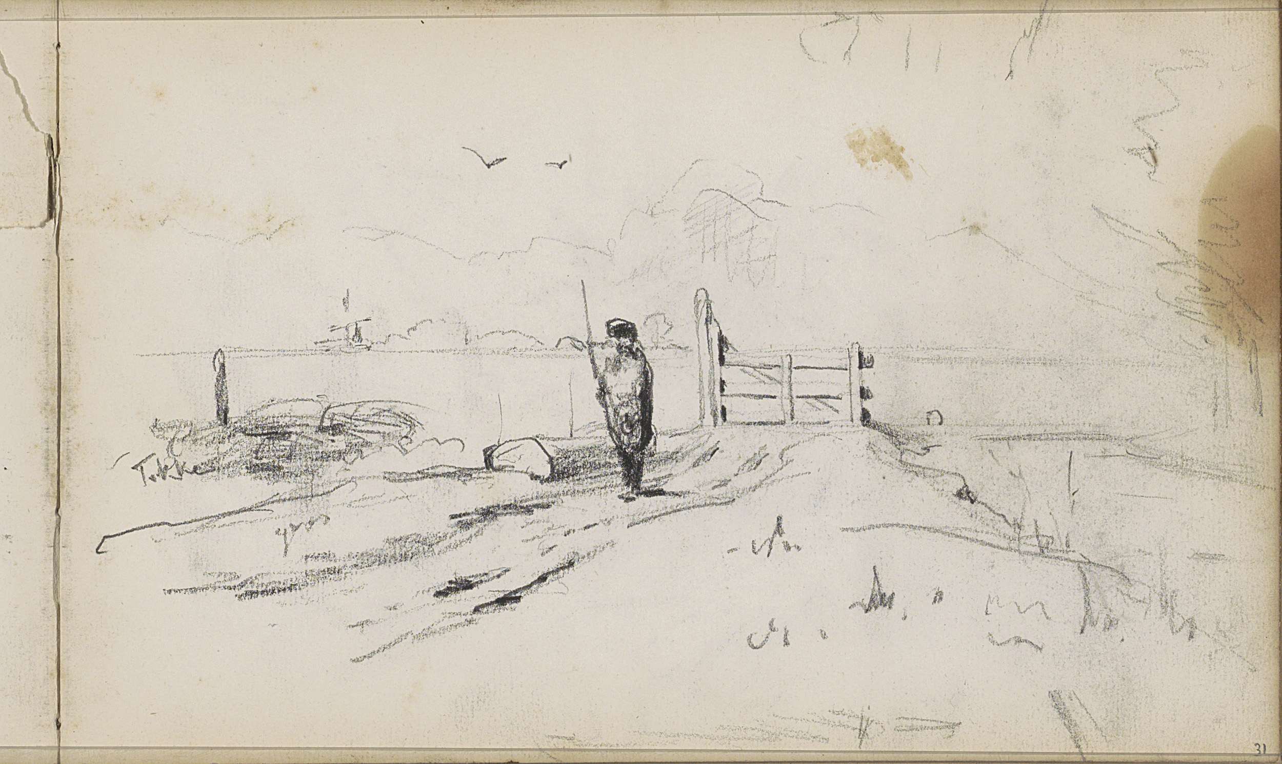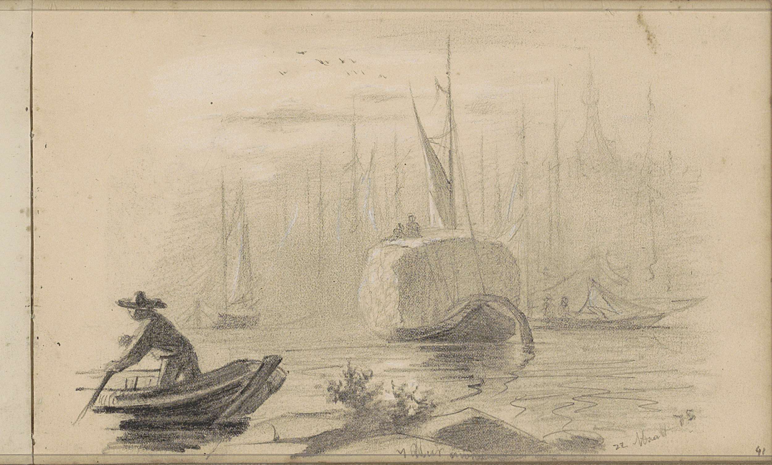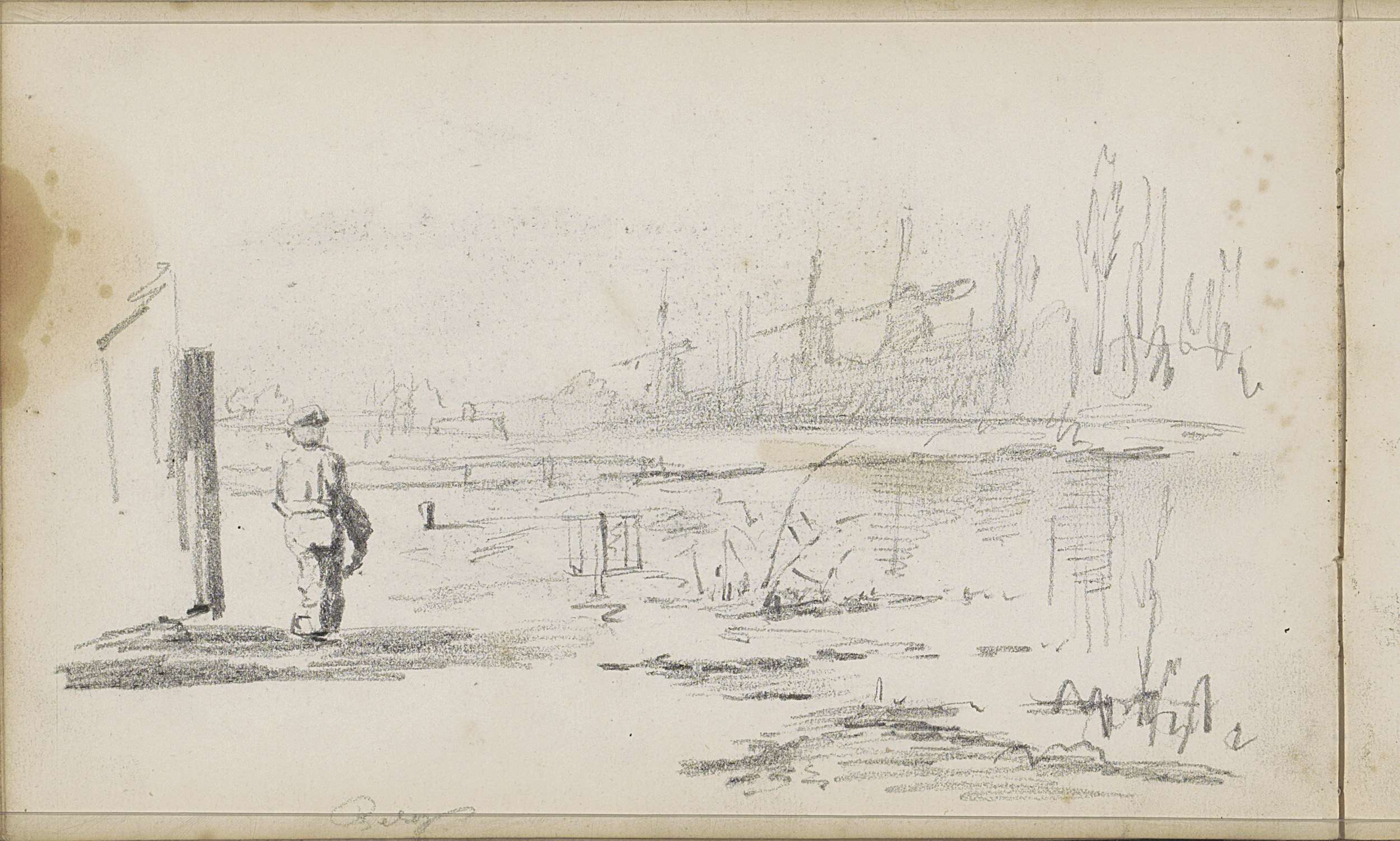 Studieblad met zeilschepen en een hek bij een weiland