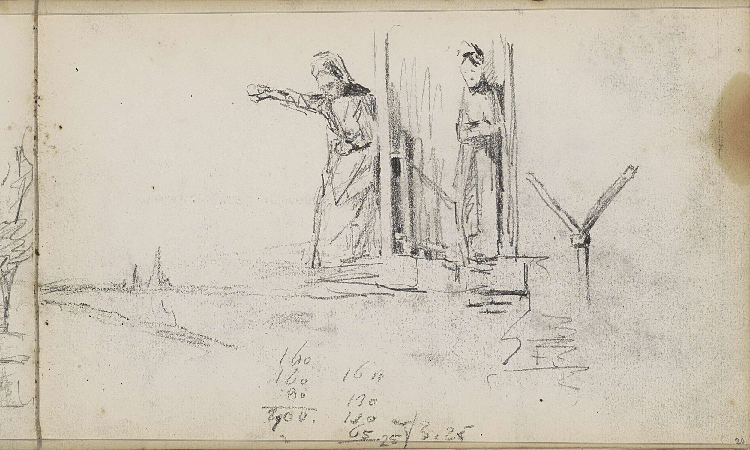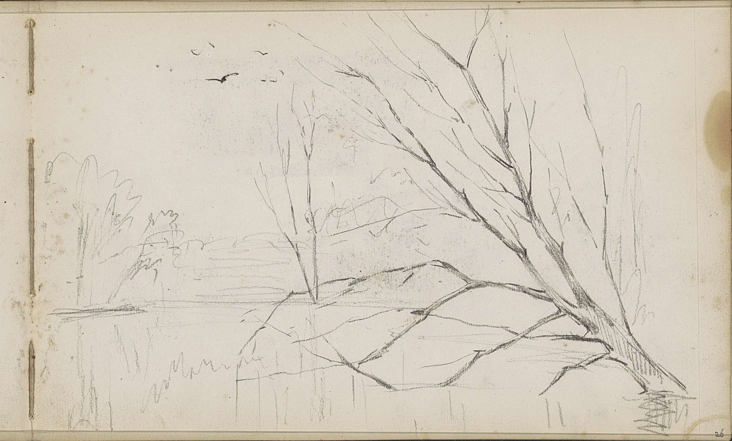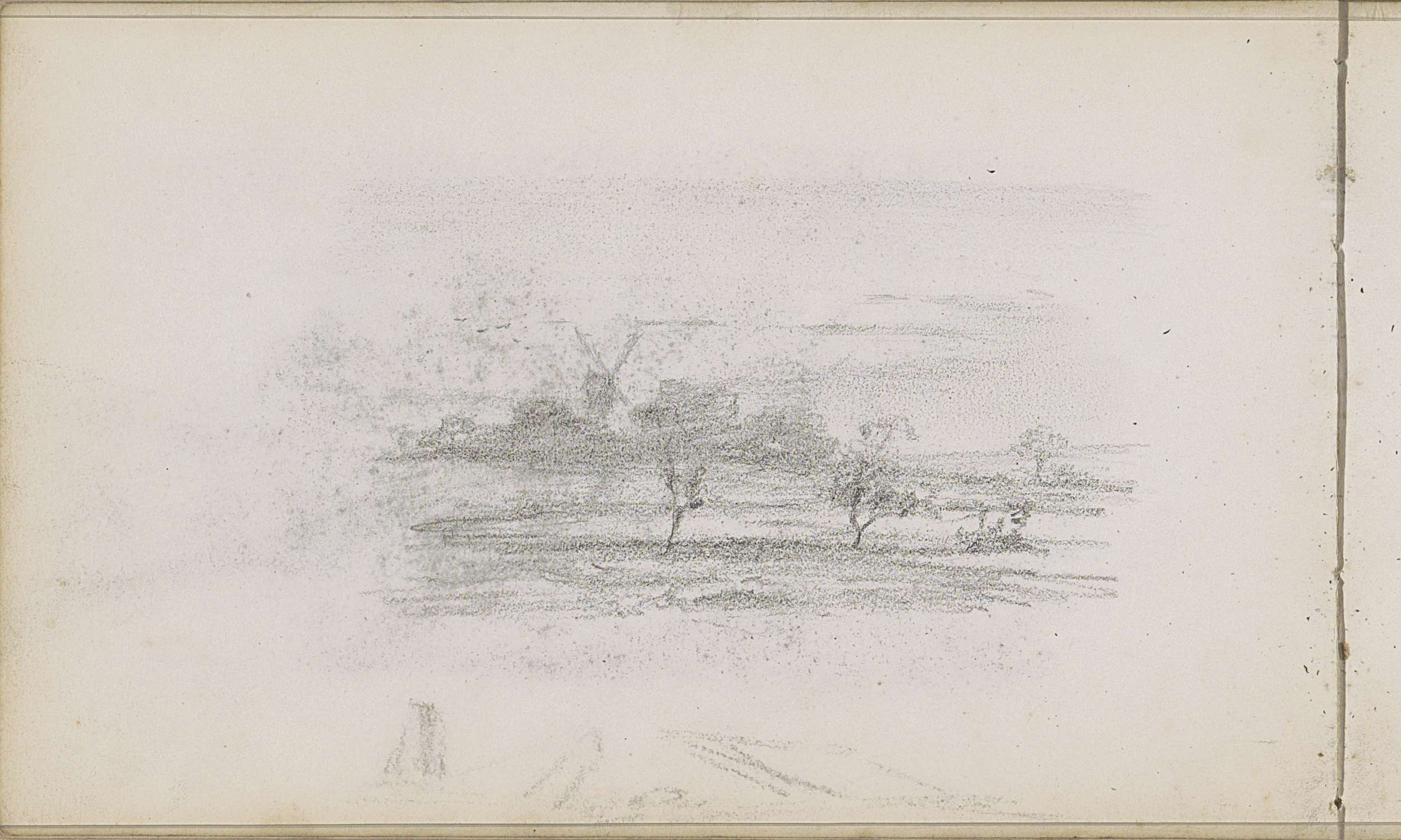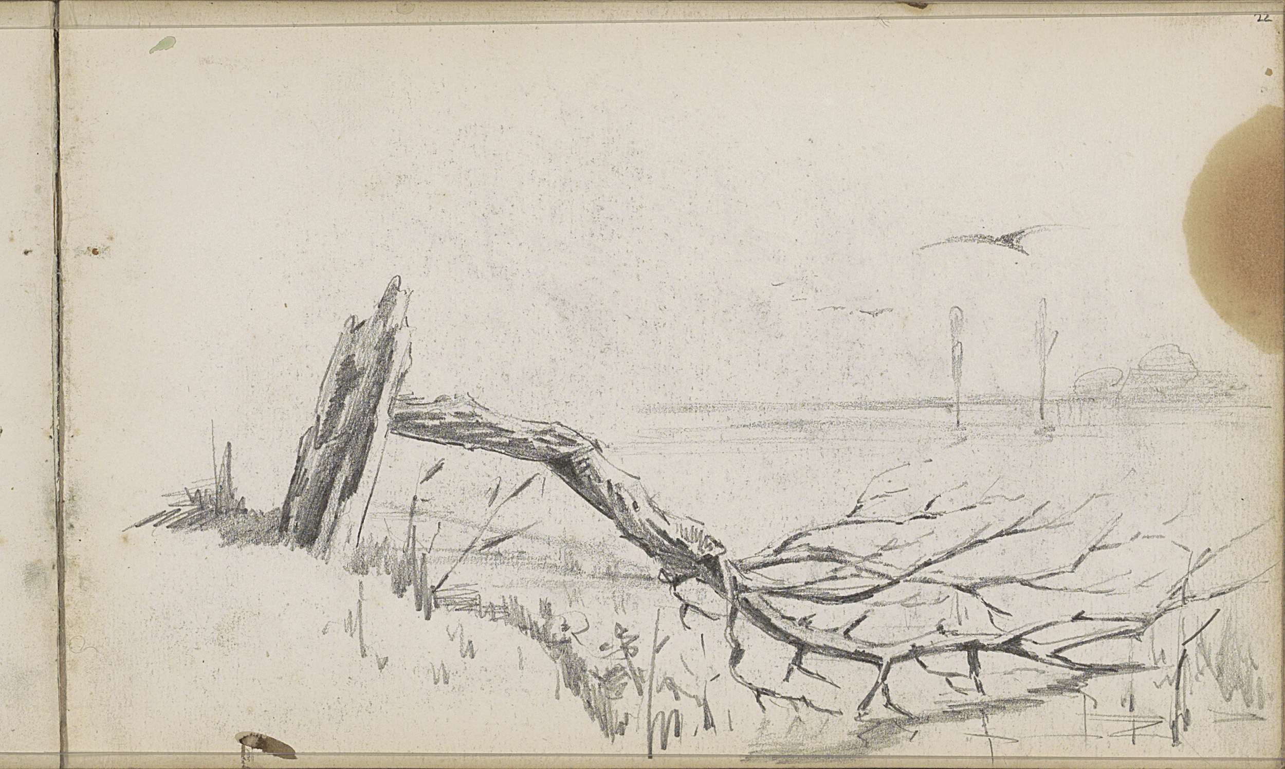 Studieblad met zeilschepen en een hek bij een weiland