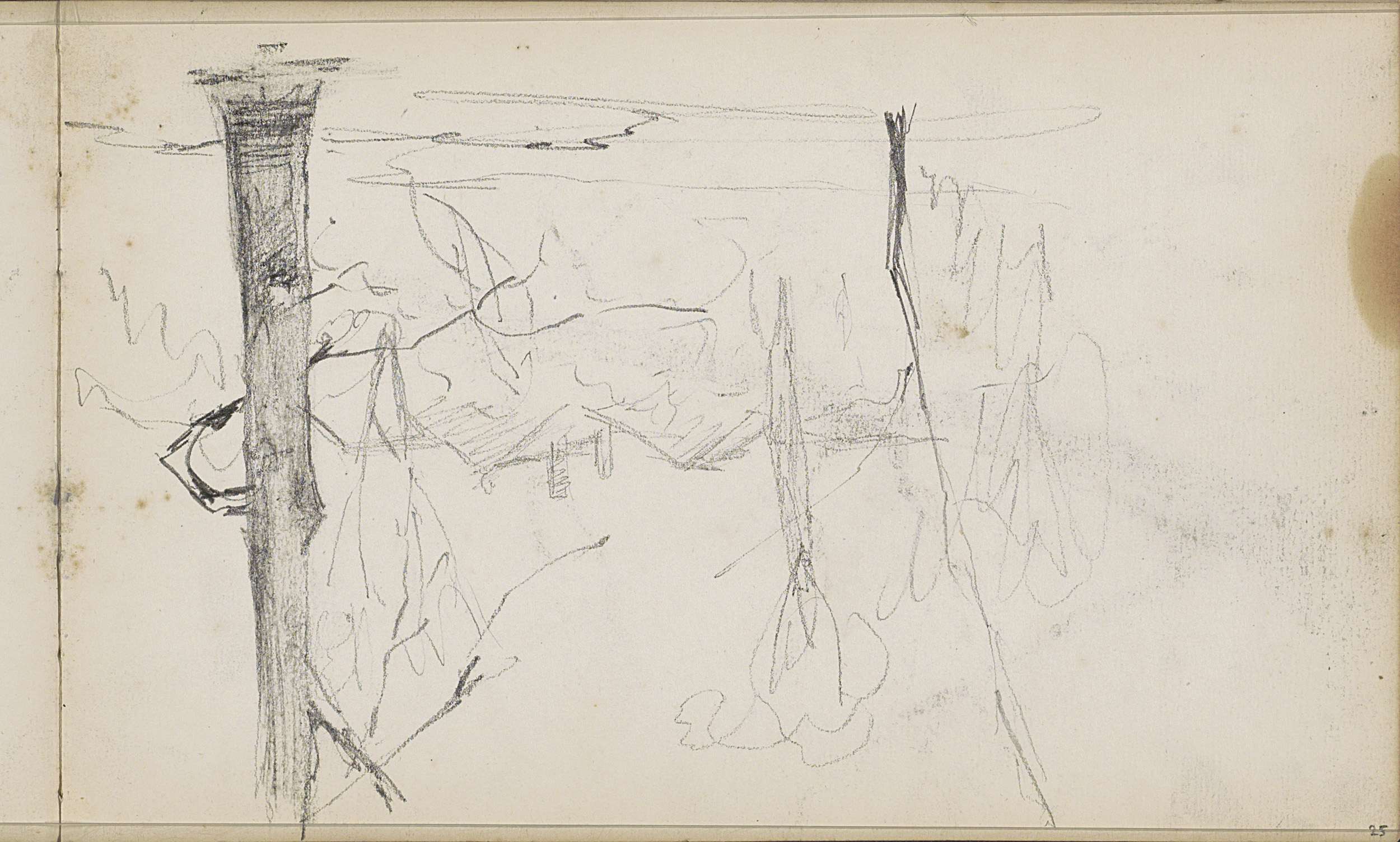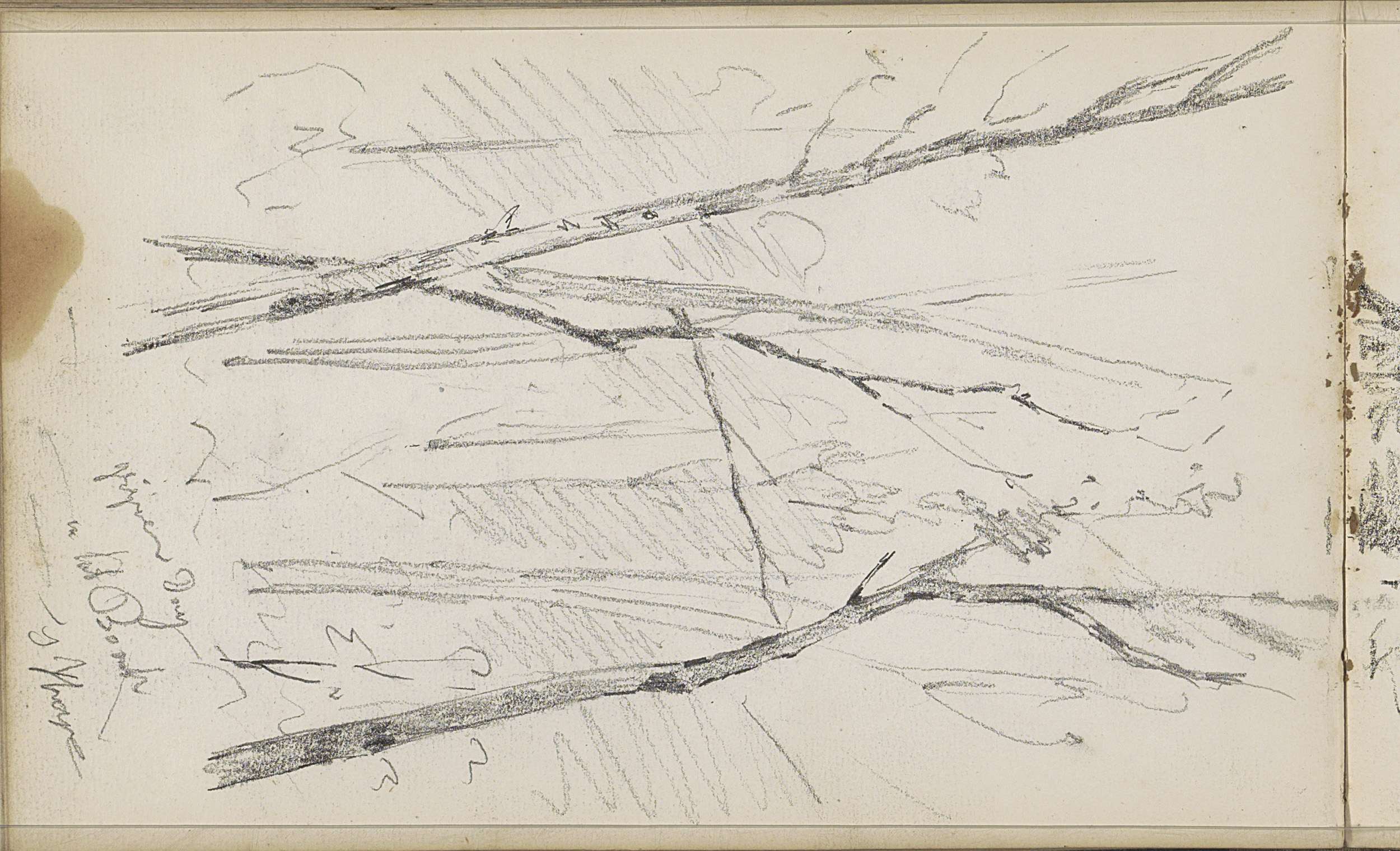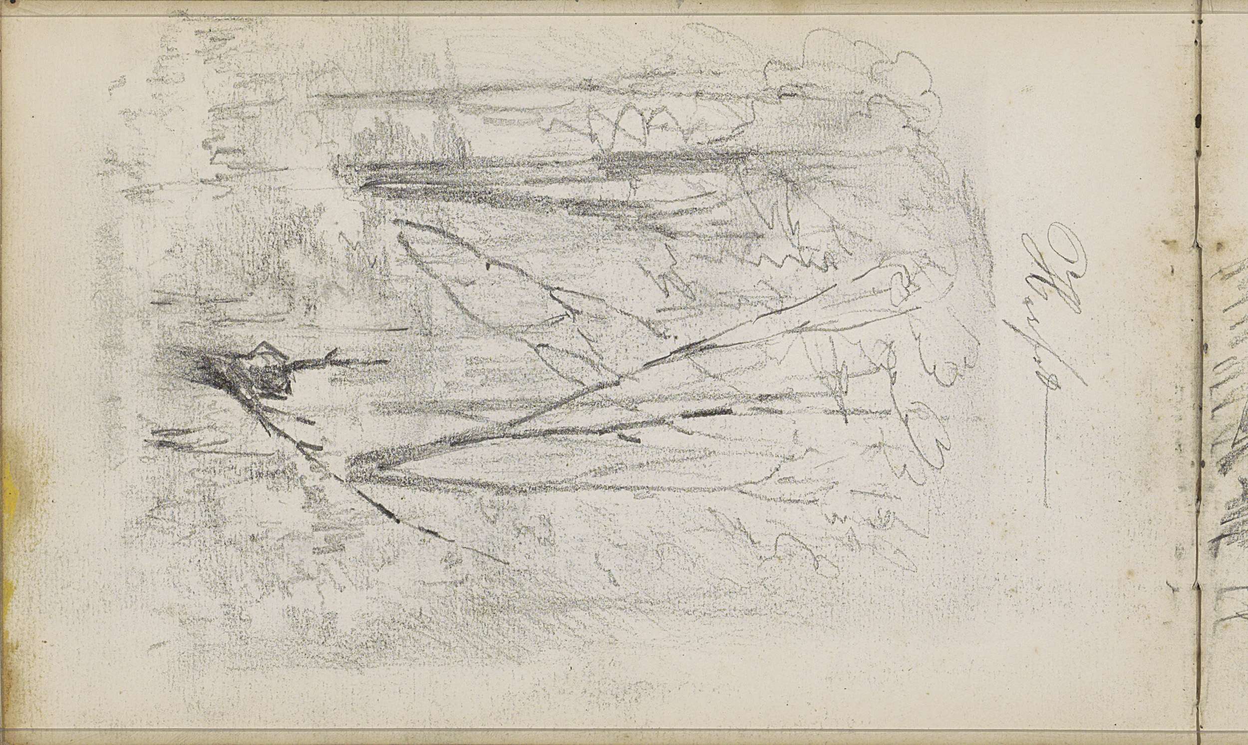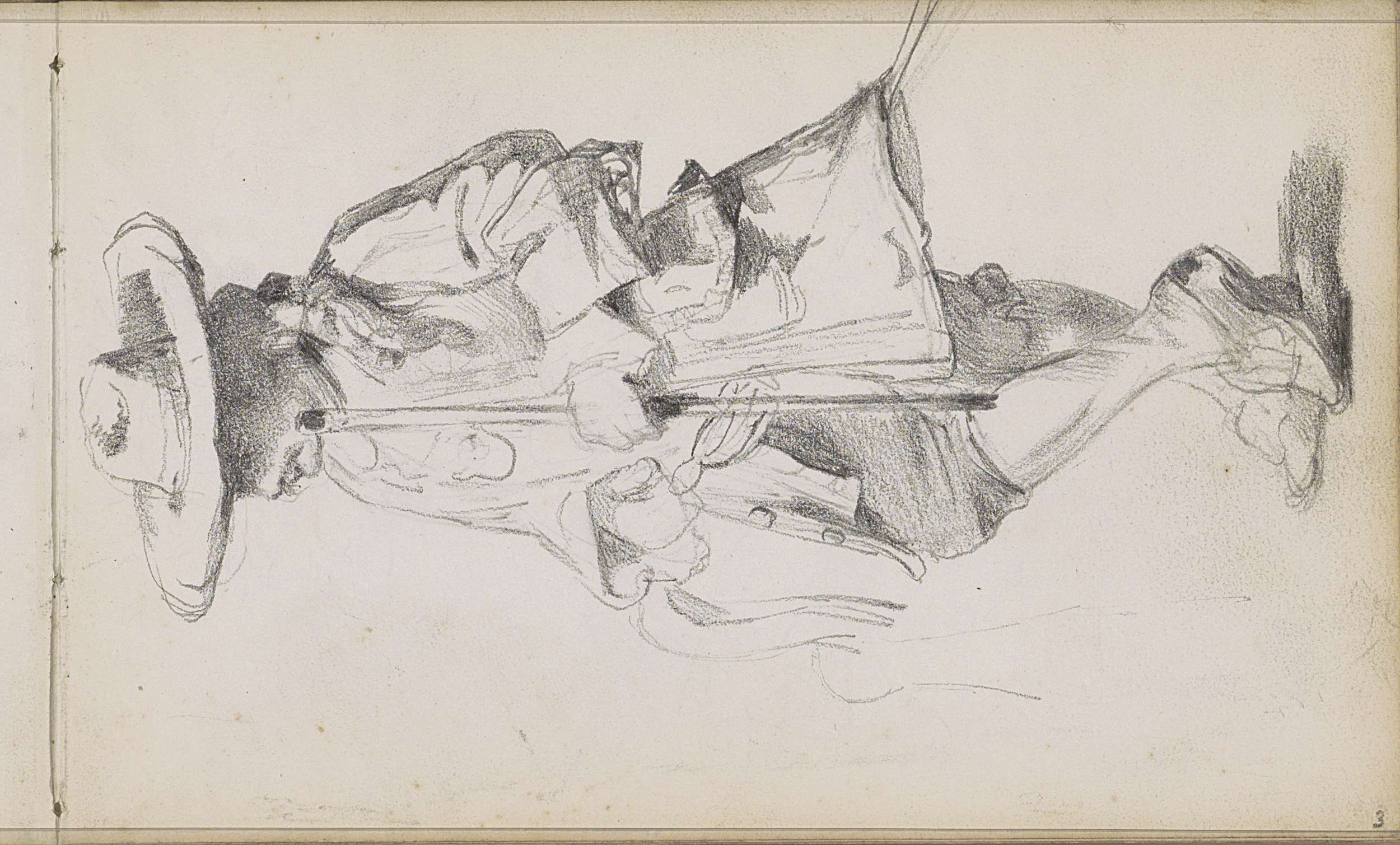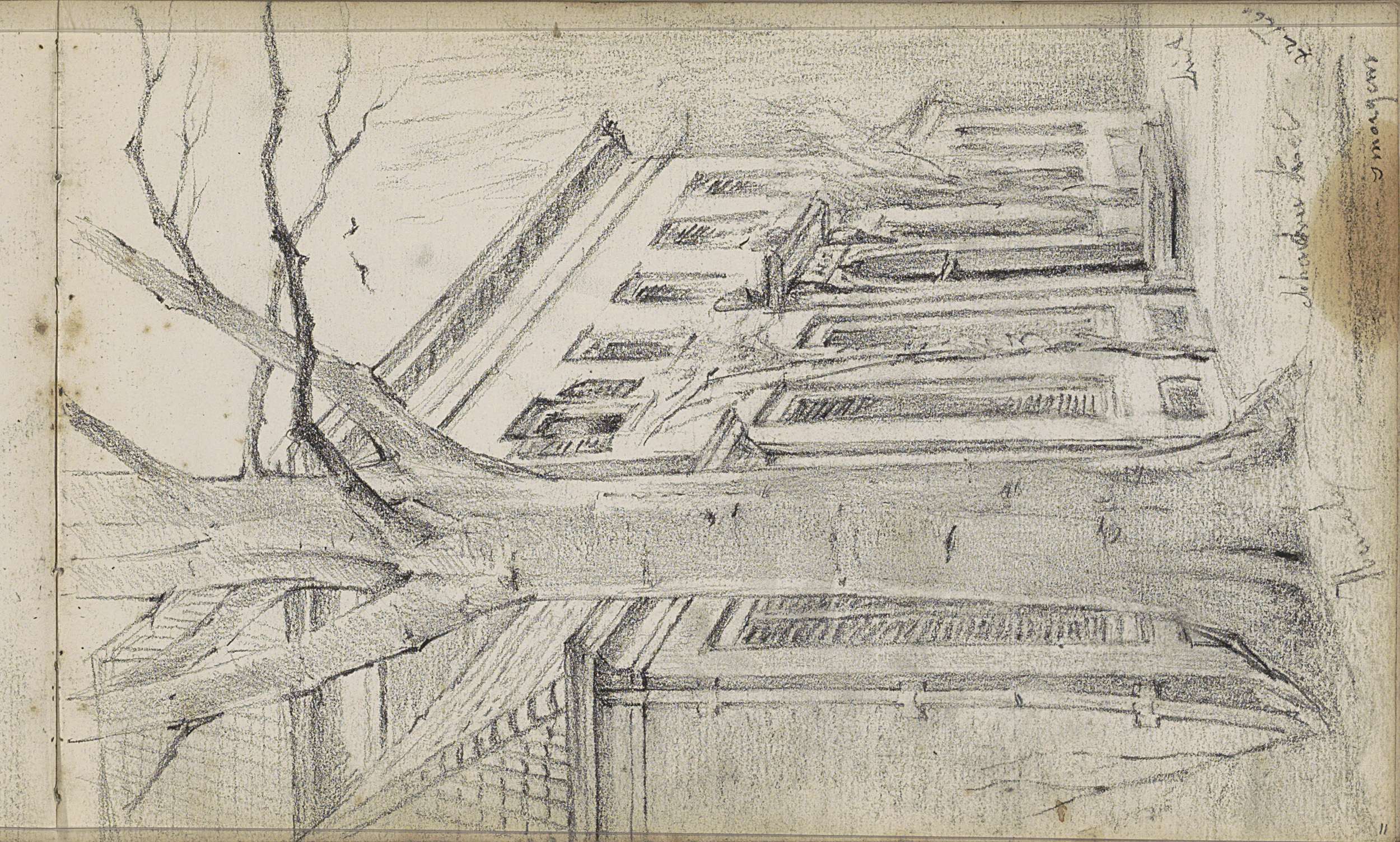 Studieblad met zeilschepen en een hek bij een weiland