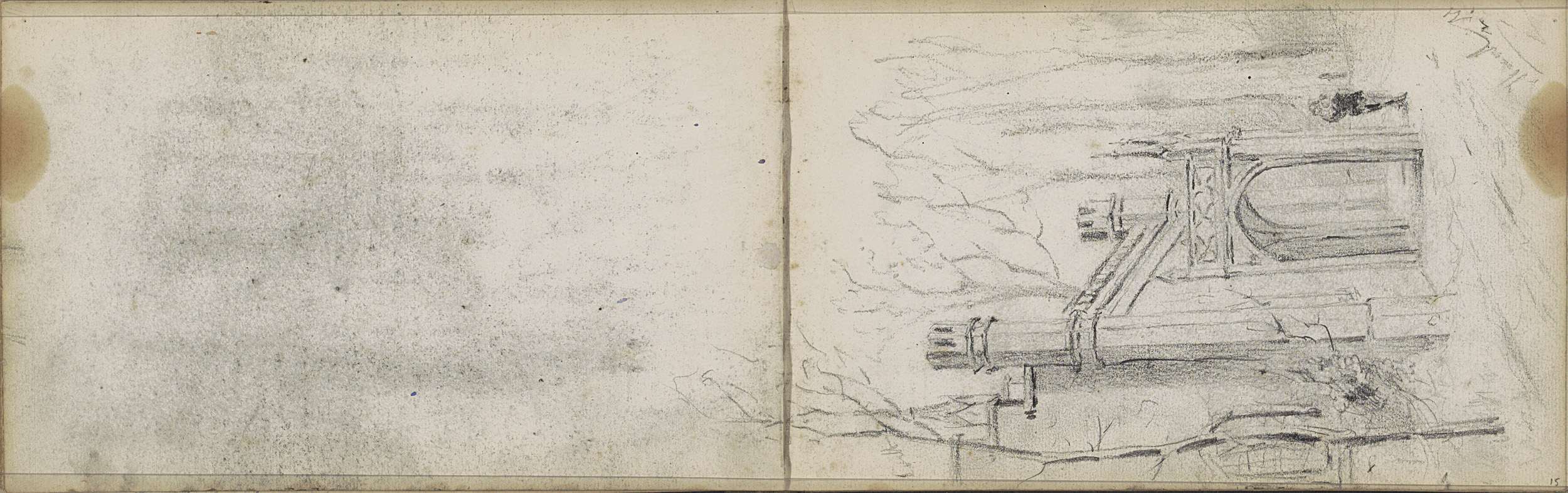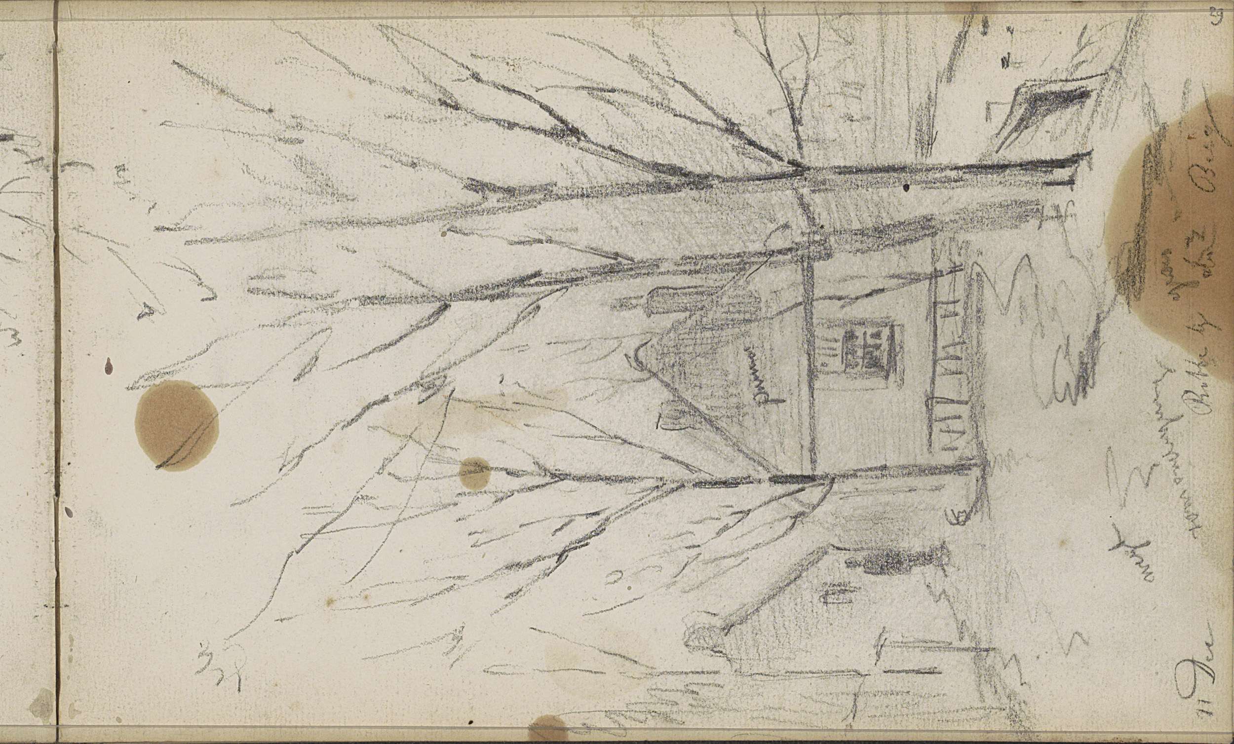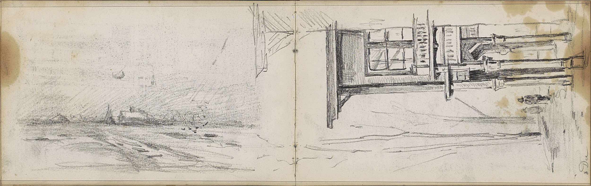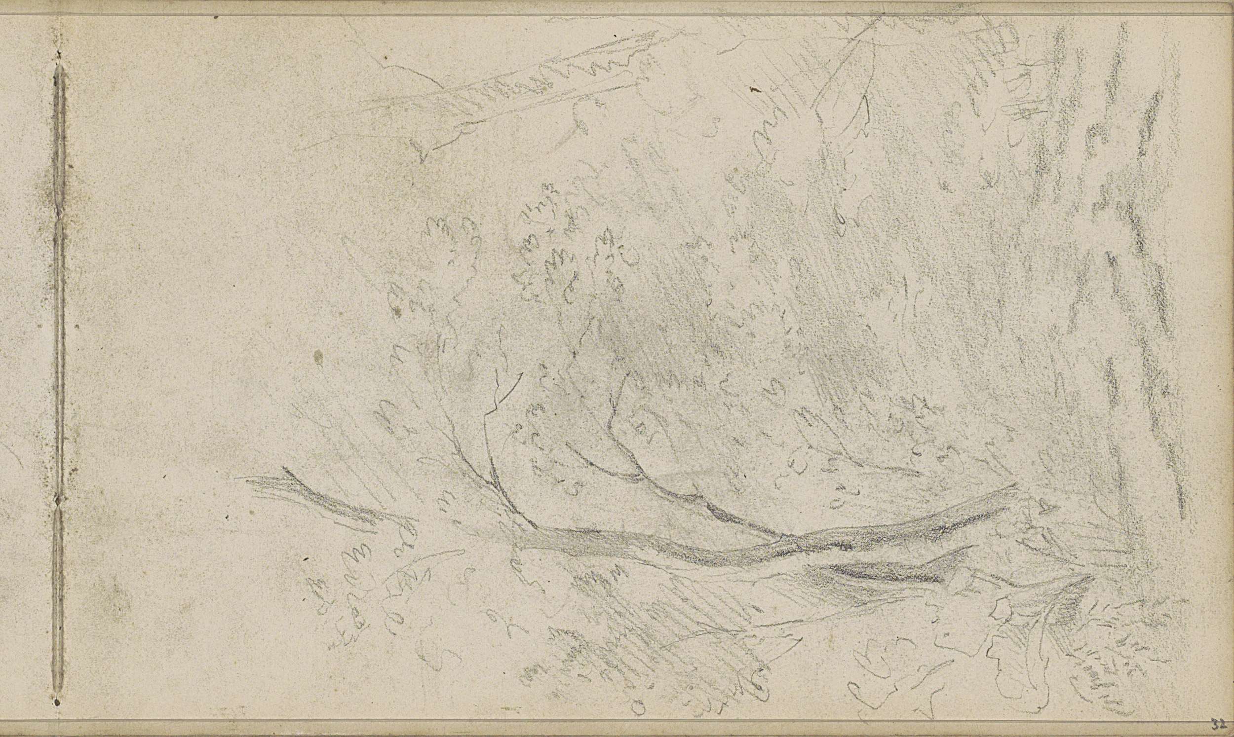 Studieblad met zeilschepen en een hek bij een weiland