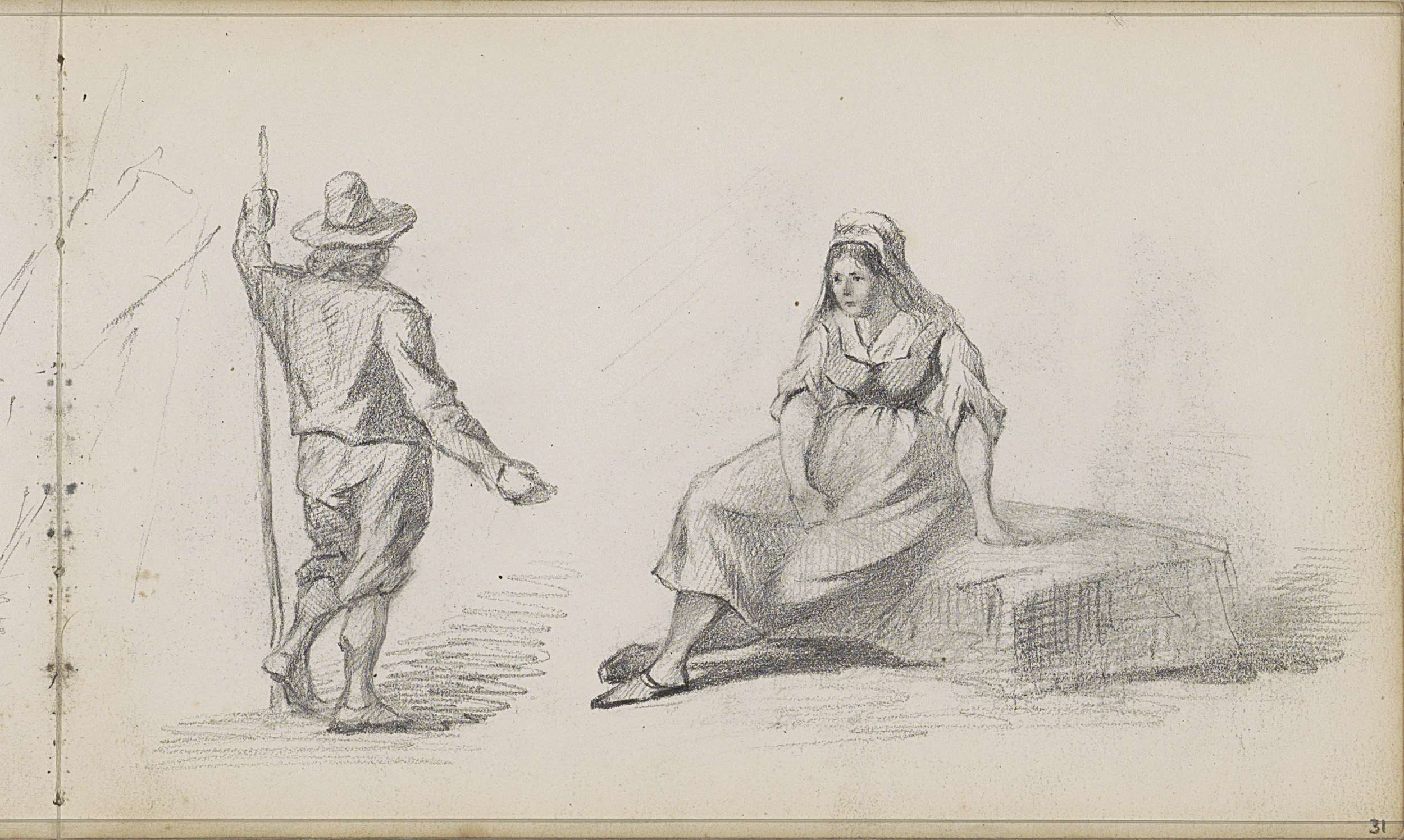 Zittende vrouw op een steen en een man met een geweer