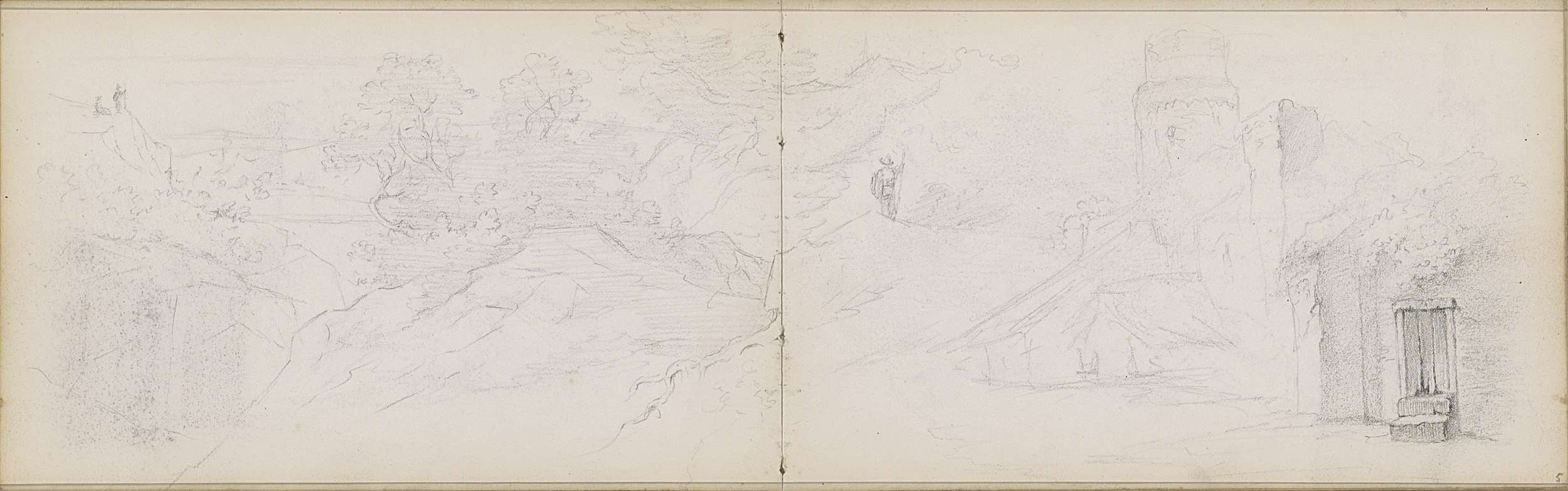 Heuvellandschap met figuren en een toren