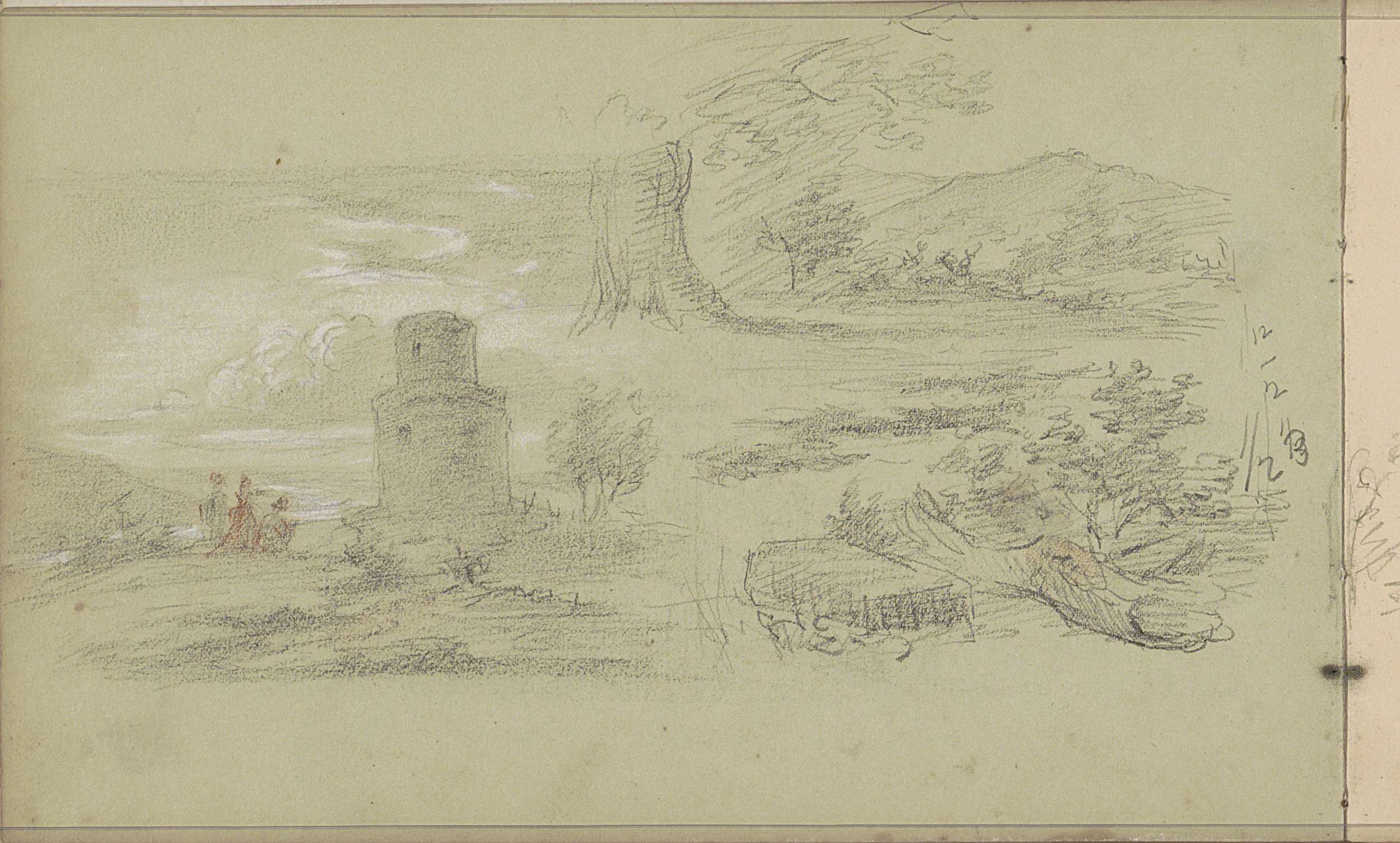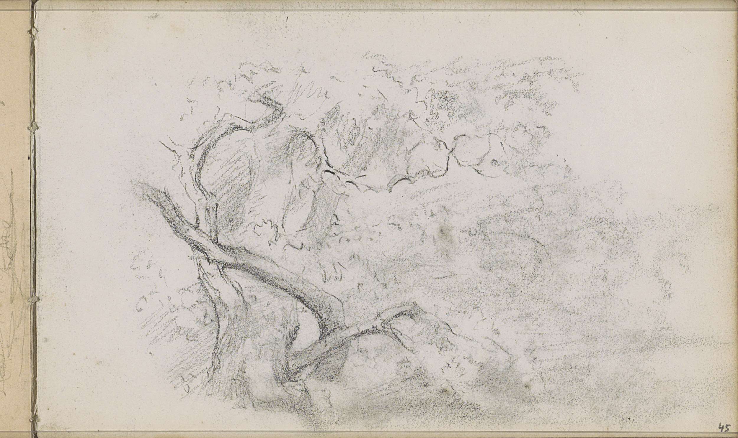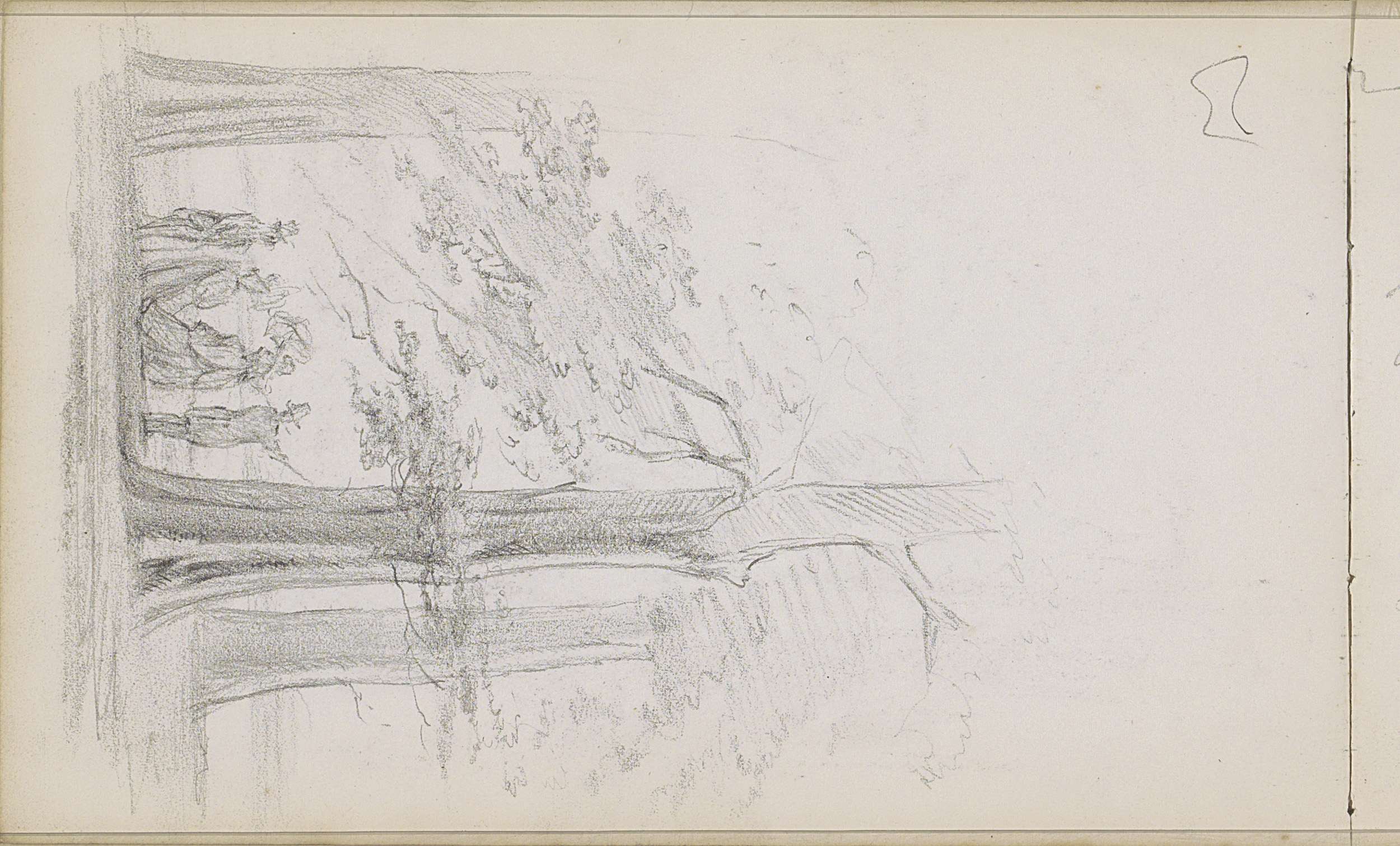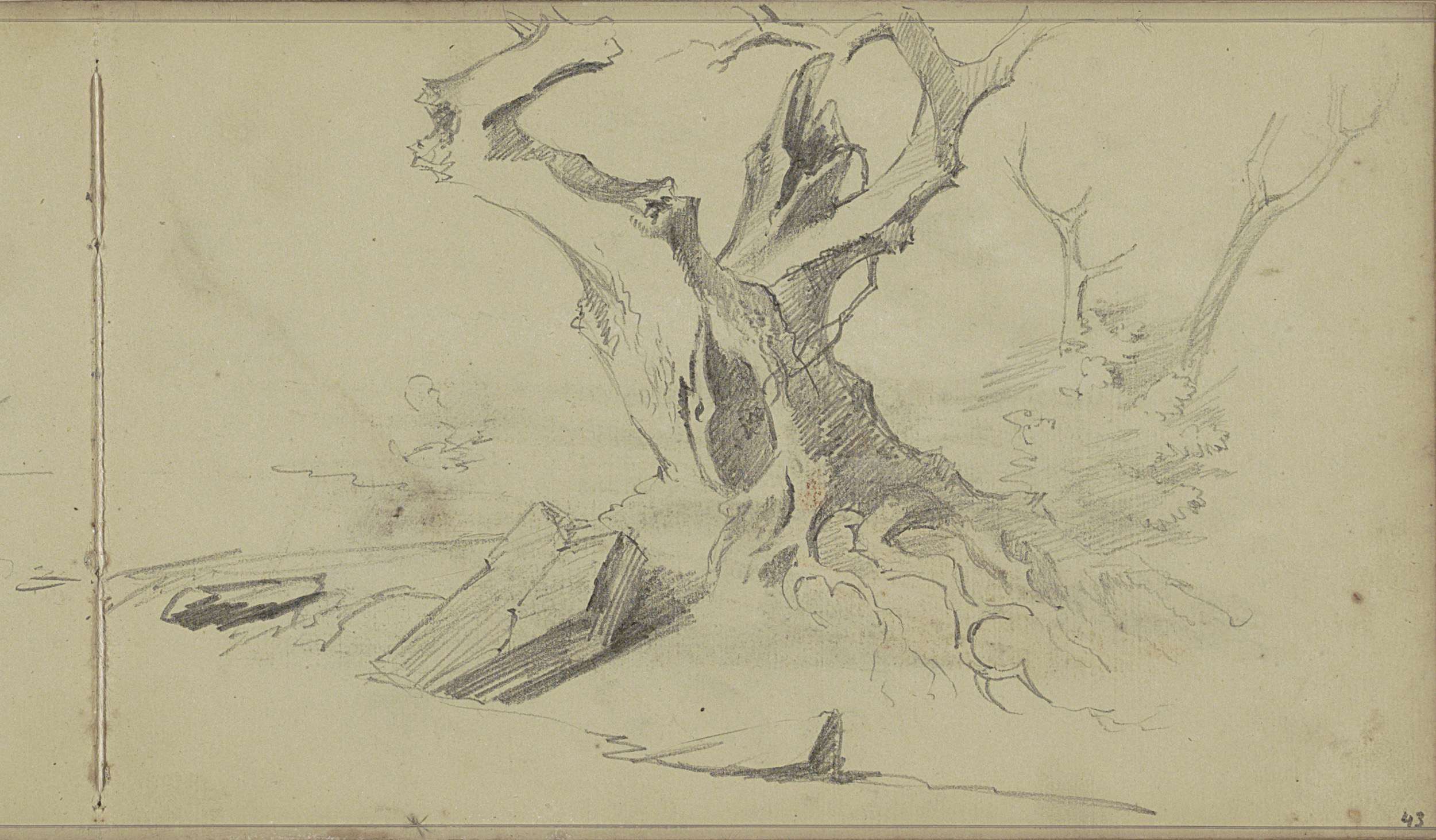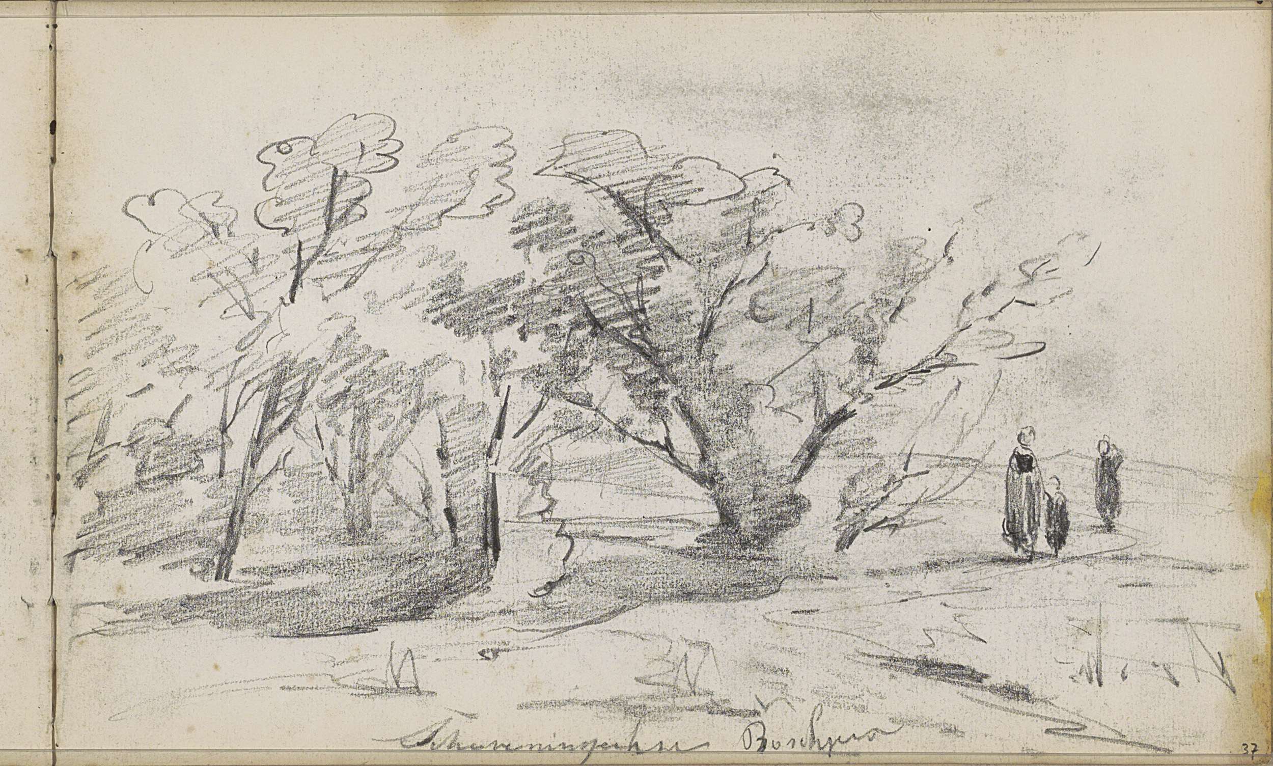 Studieblad met een boom en zittende naakte figuren