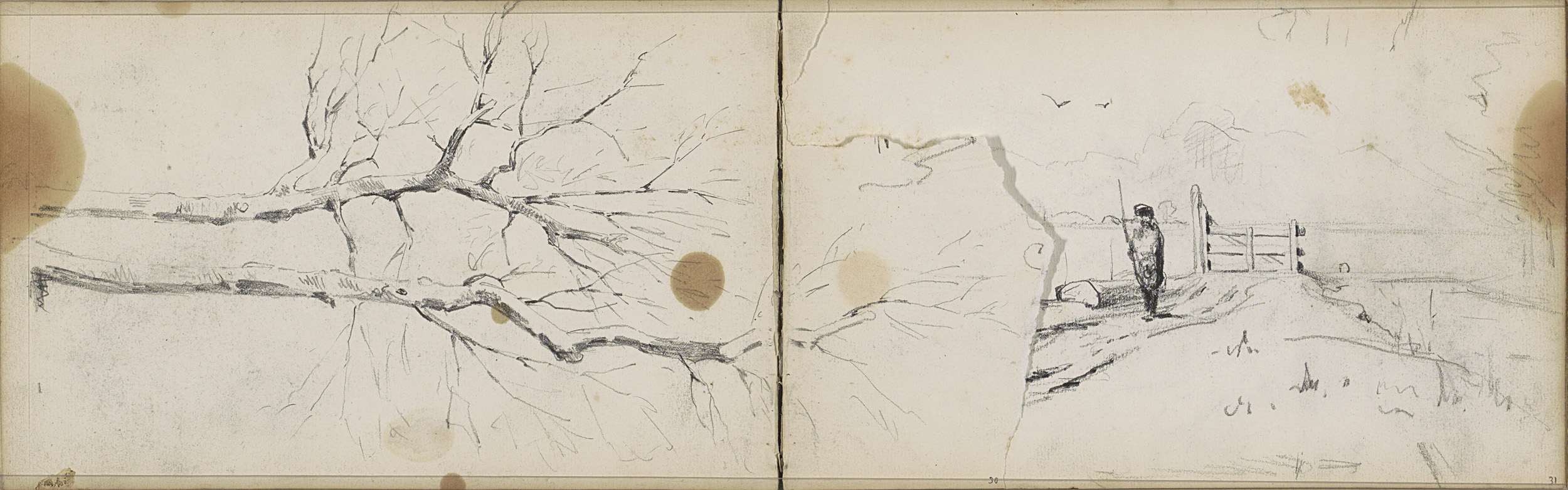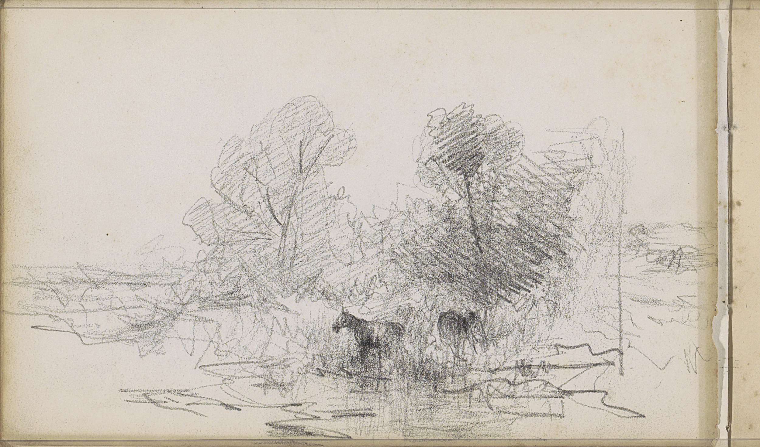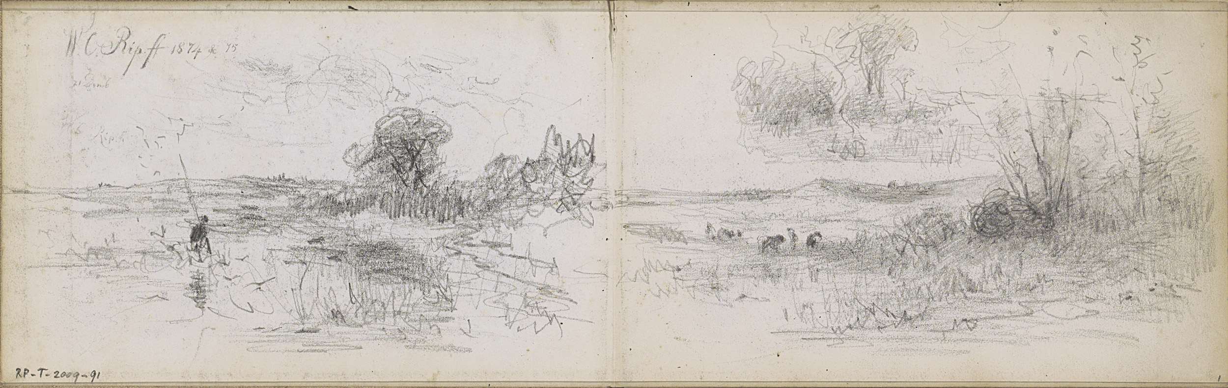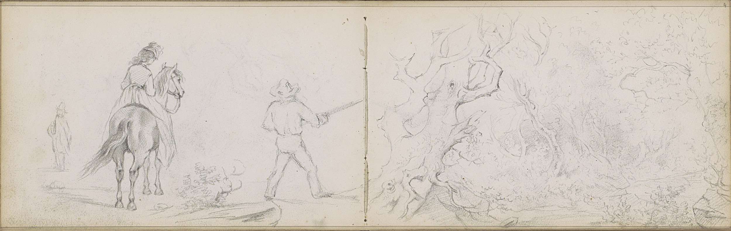 Studieblad met jagers, een herder, bomen en koeien