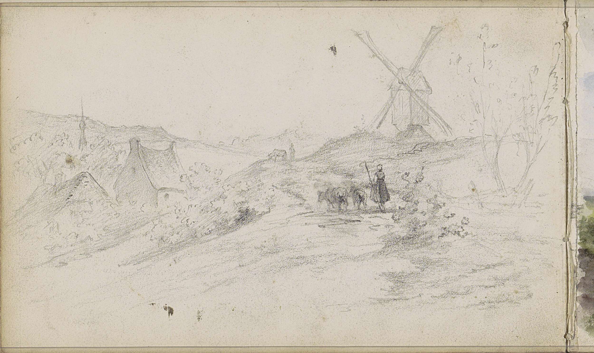 Herderin op een pad langs een molen