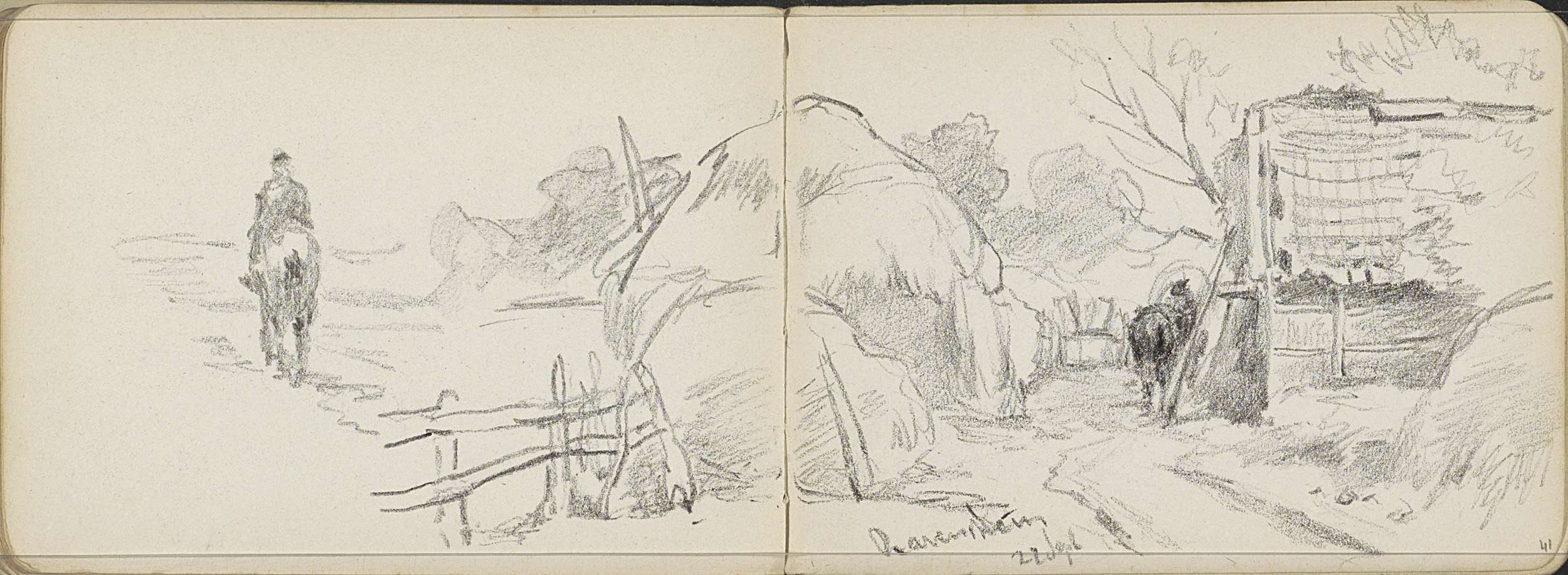 Hooiberg bij een schuur en een ruiter op een pad te ...