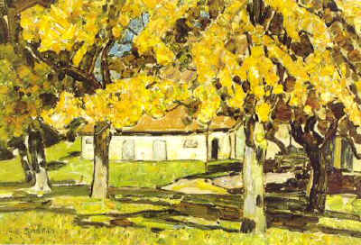 Een oude schuur onder geboomte