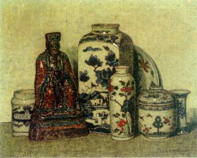 'Oud porcelein' stilleven met Delftsche vaas en een ...
