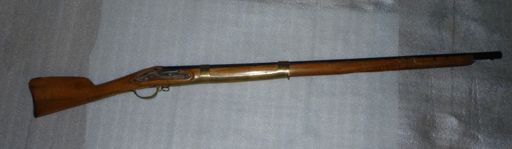 Geweer, zgn. vuursteenmusket, met bajonet, van hout,...