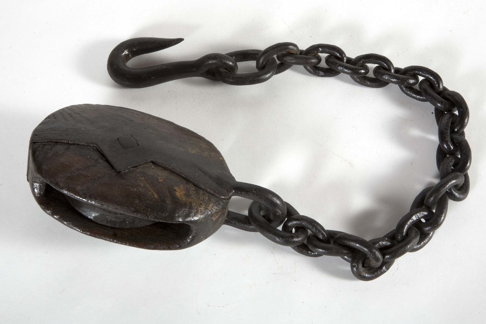 Katrol van hout en ijzer, aan de ring een korte kett...