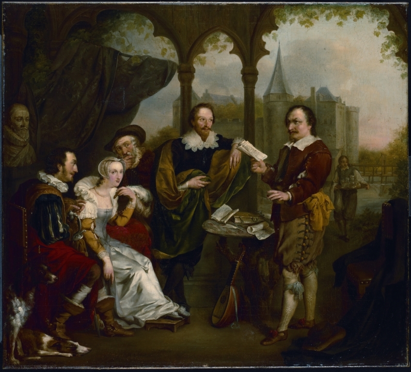 Vondel een dichtstuk voorlezende in het paviljoen op...