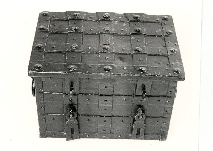 Beschilderde geldkist beslagen met hoekbanden