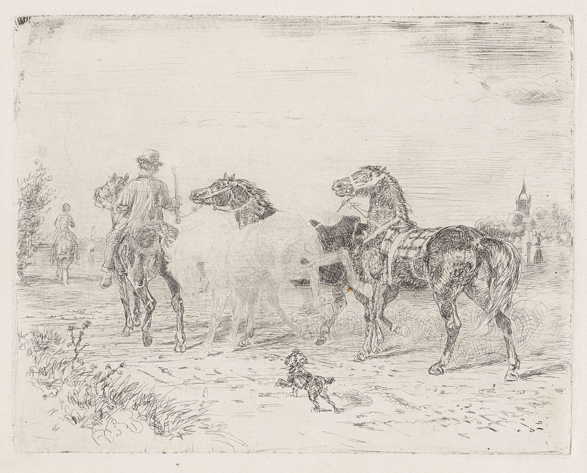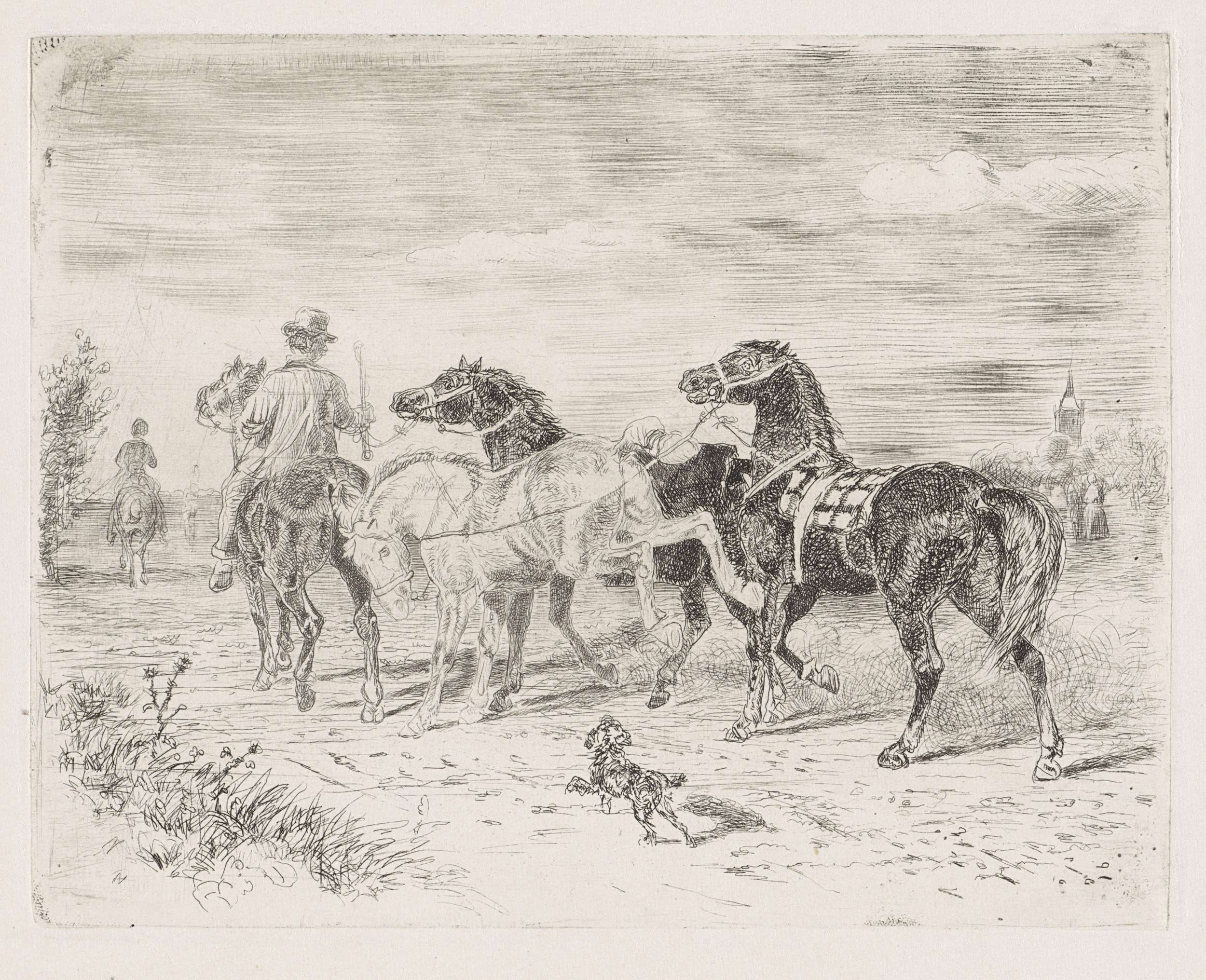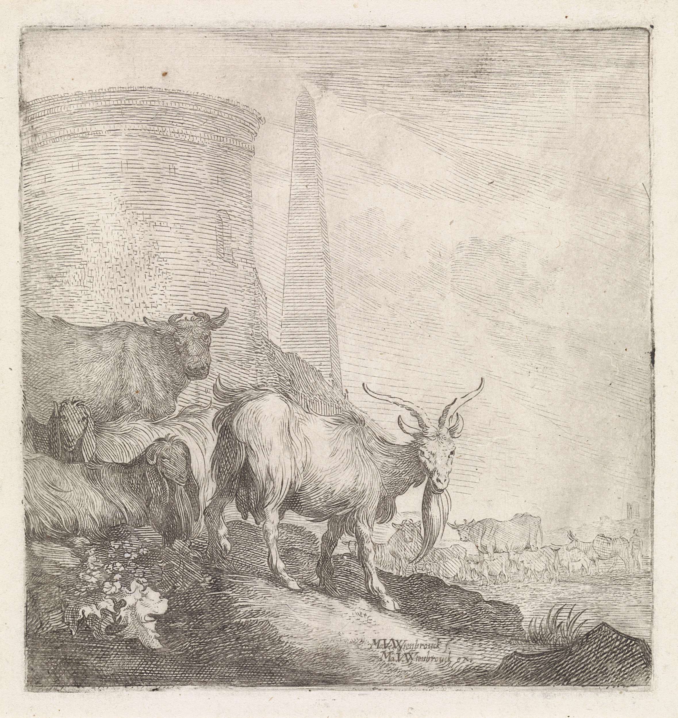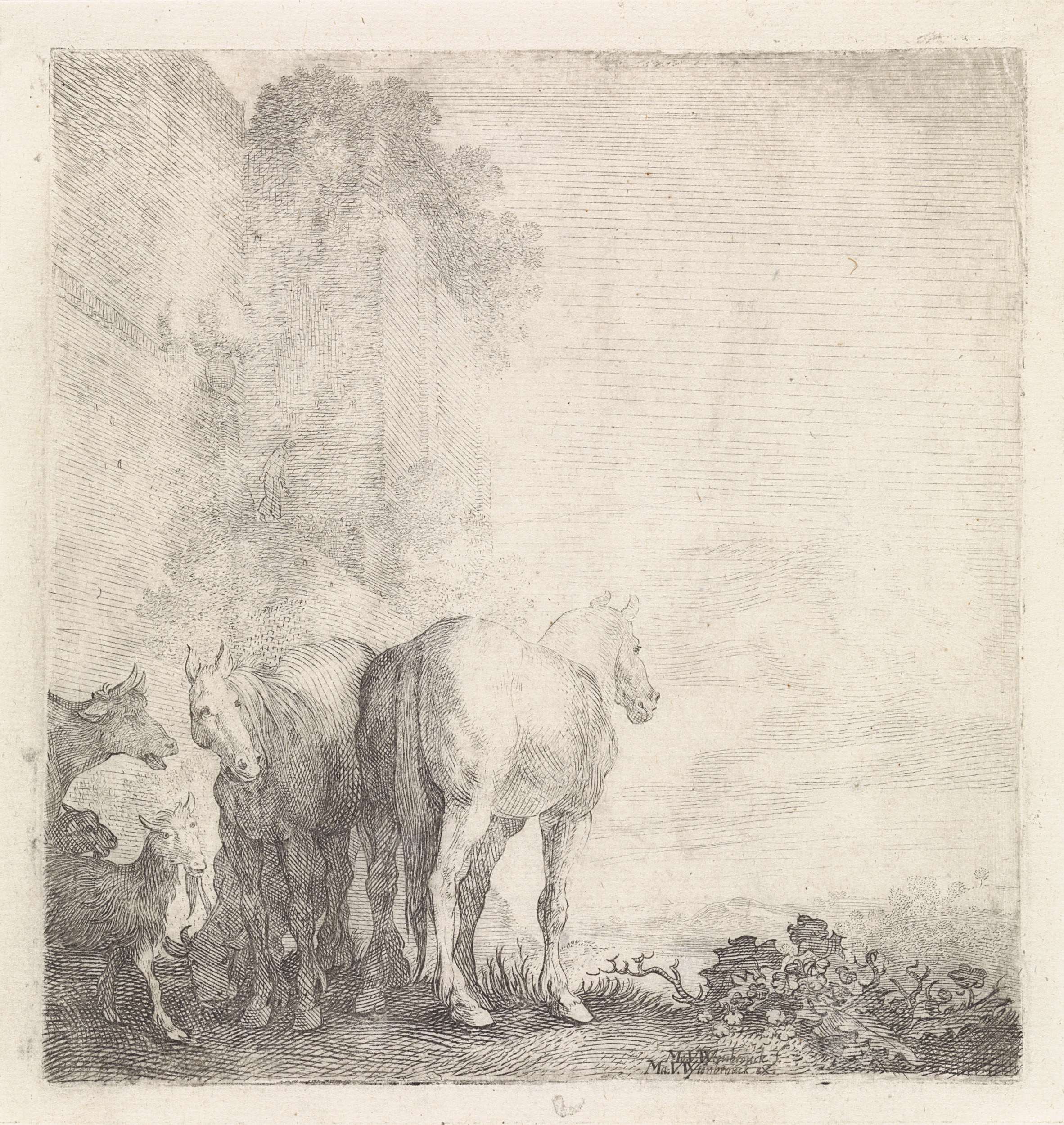 Twee paarden met geiten en een koe bij een hoge (sta...