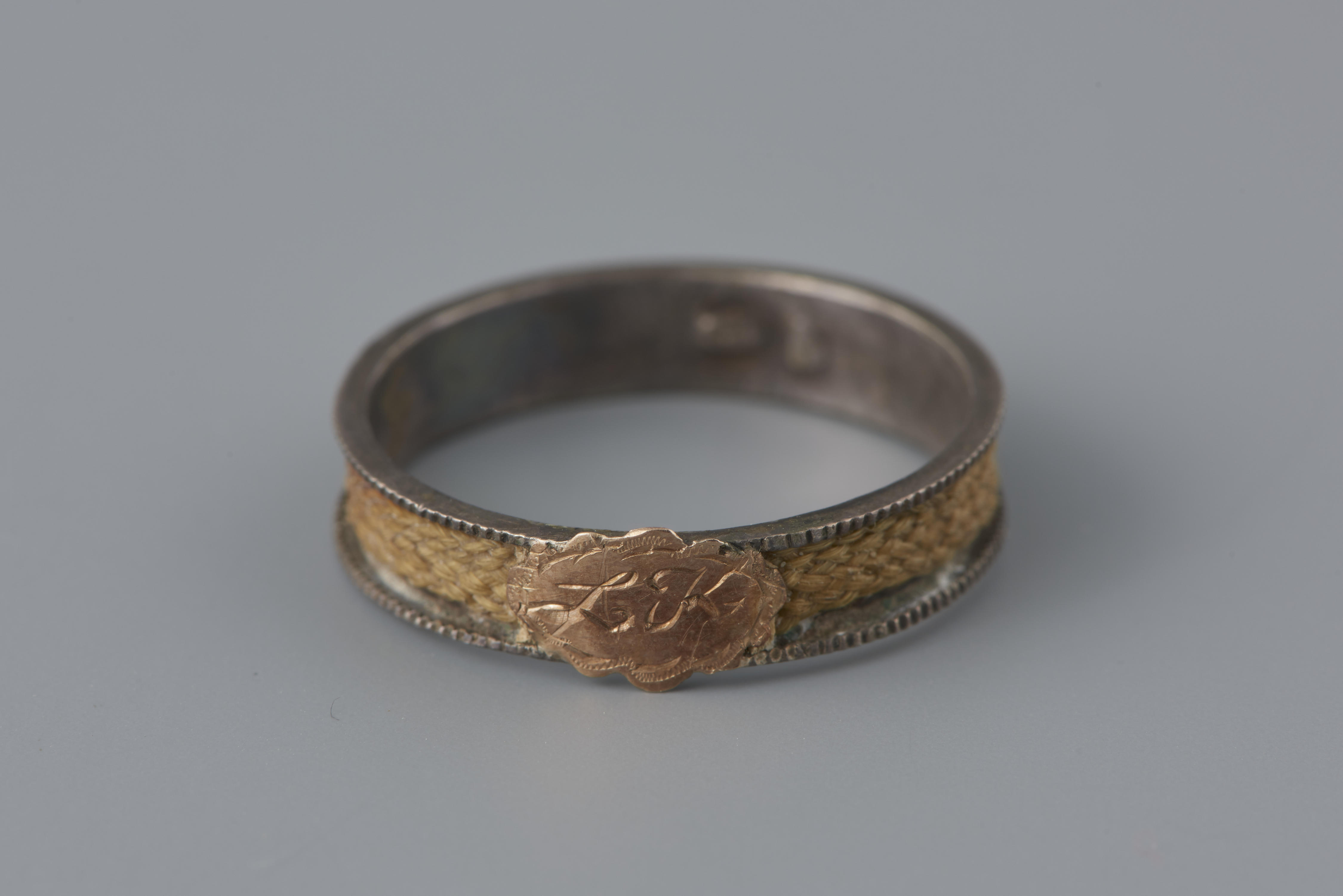 Zilveren ring met haarlok en gouden plaatje, Marken