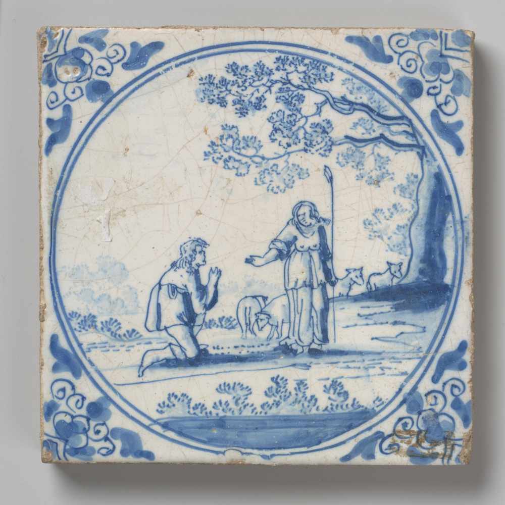 tegel van keramiek met tinglazuur, voorstellende: sa...