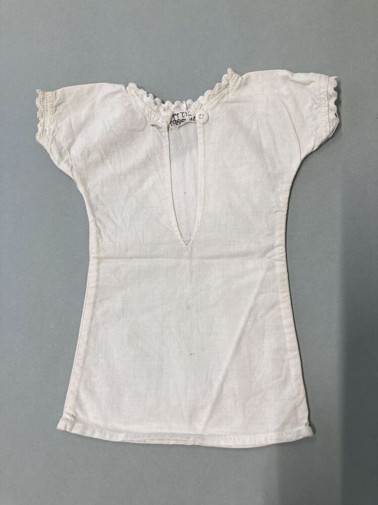 Poppen-boezelaar van stevig wit katoen afgewerkt met...