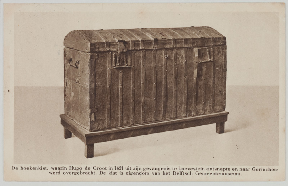 Hugo de Groot verbergt zich in de boekenkist