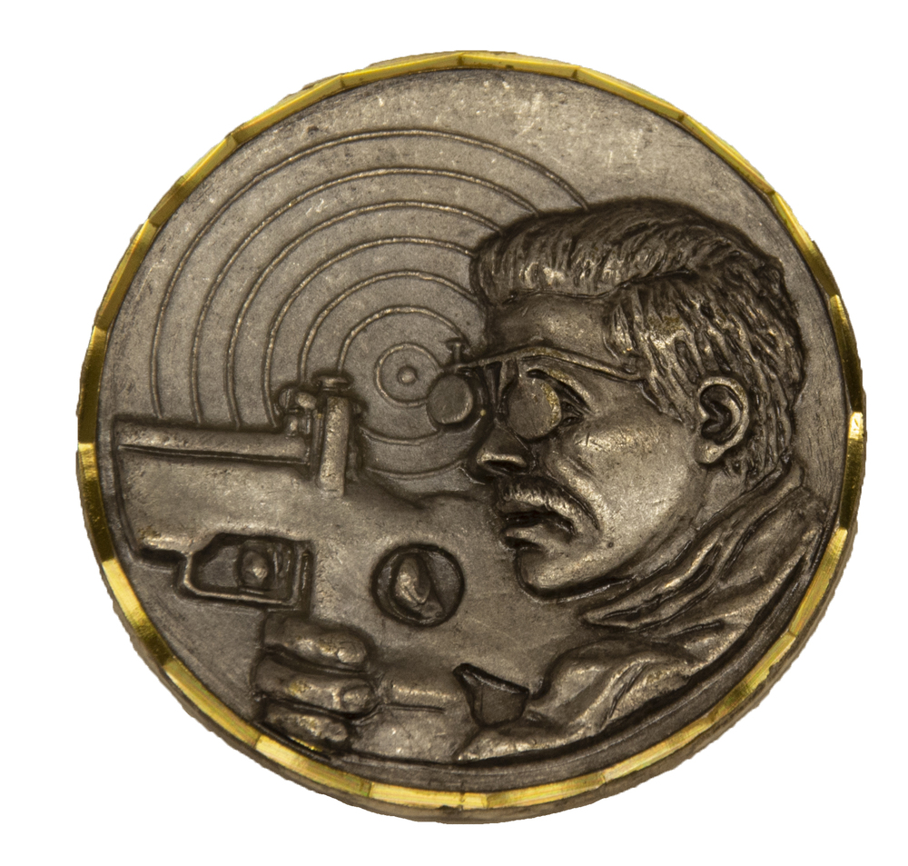 Medaille van metaal met een afbeelding van een schut...