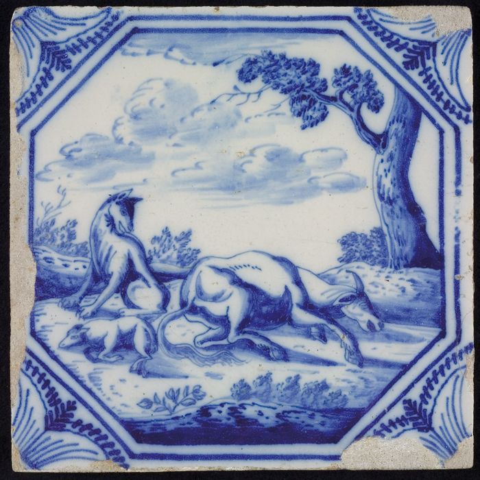 Tegel met mythologisch tafereel met wolf, in achtkan...