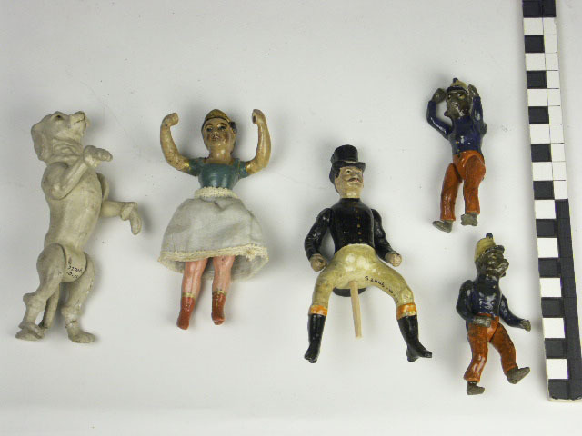 Circusfiguren en attributen met directeur, stalmeest...