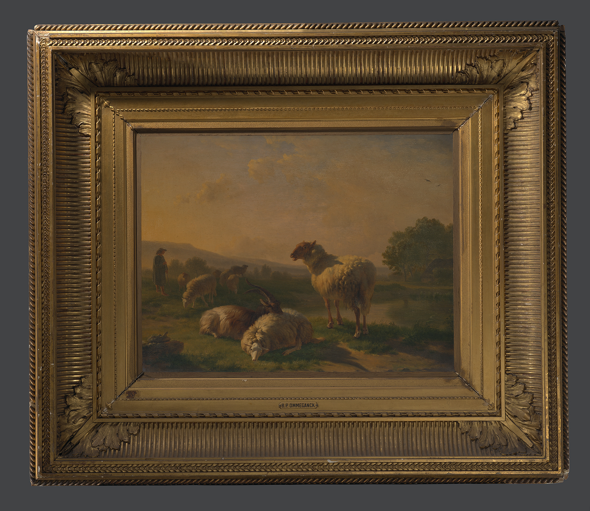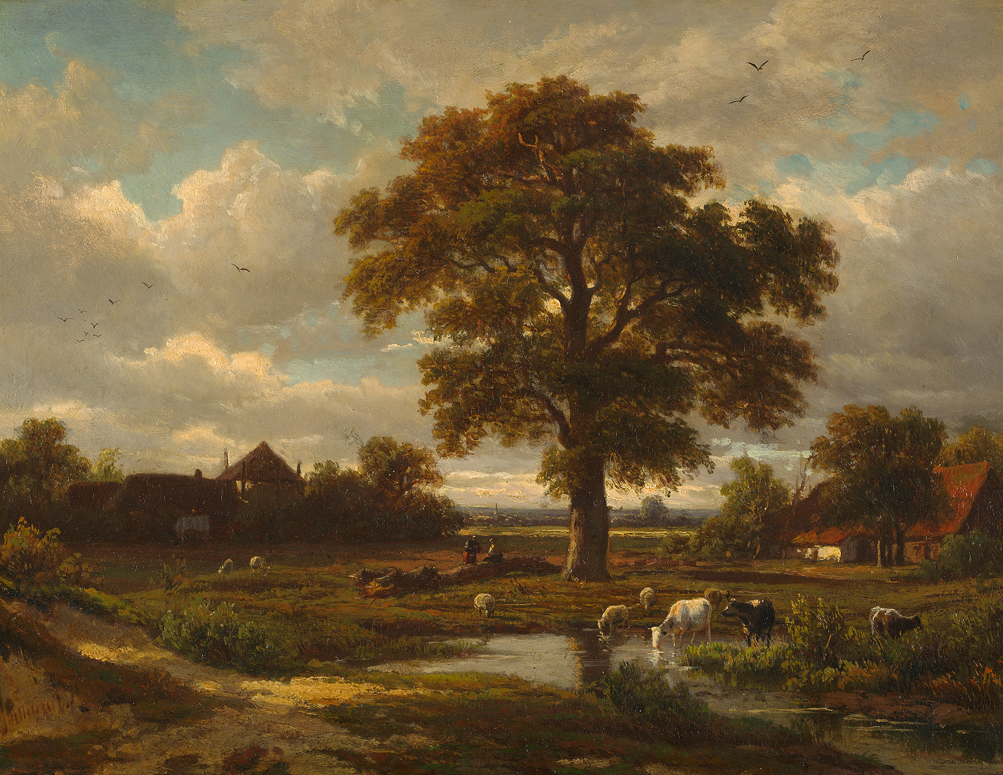Een landschap, op de voorgrond rundvee bij een plas ...