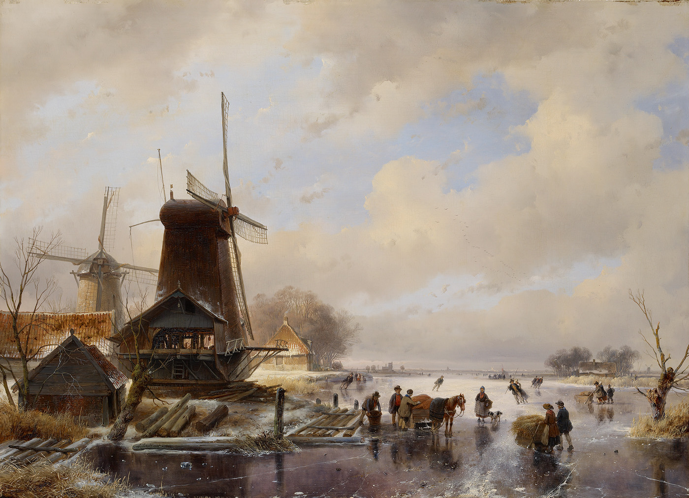 Een winterlandschap, rechts een molen en woningen bi...