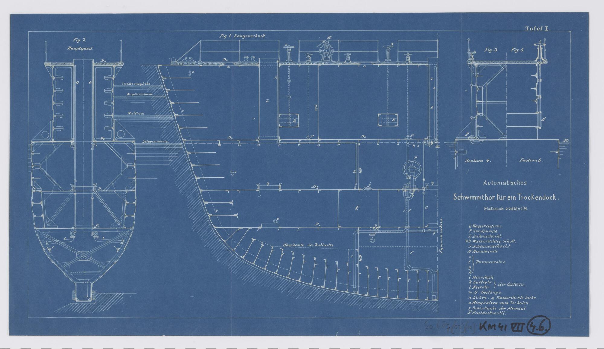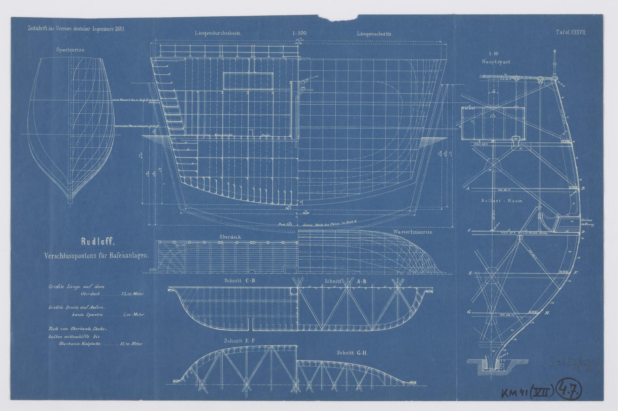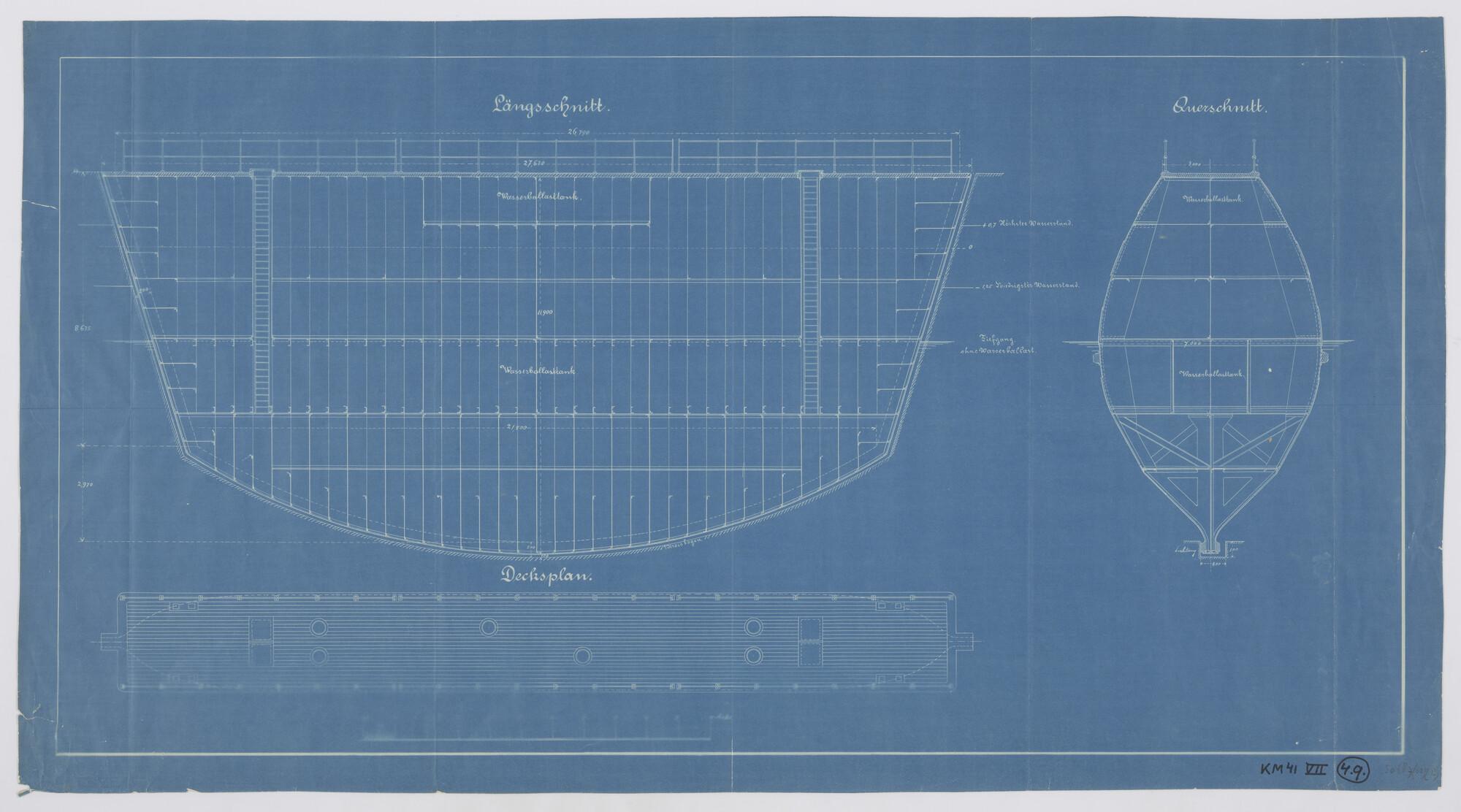 Langsdoorsnede, bovenaanzicht en vooraanzicht van "T...