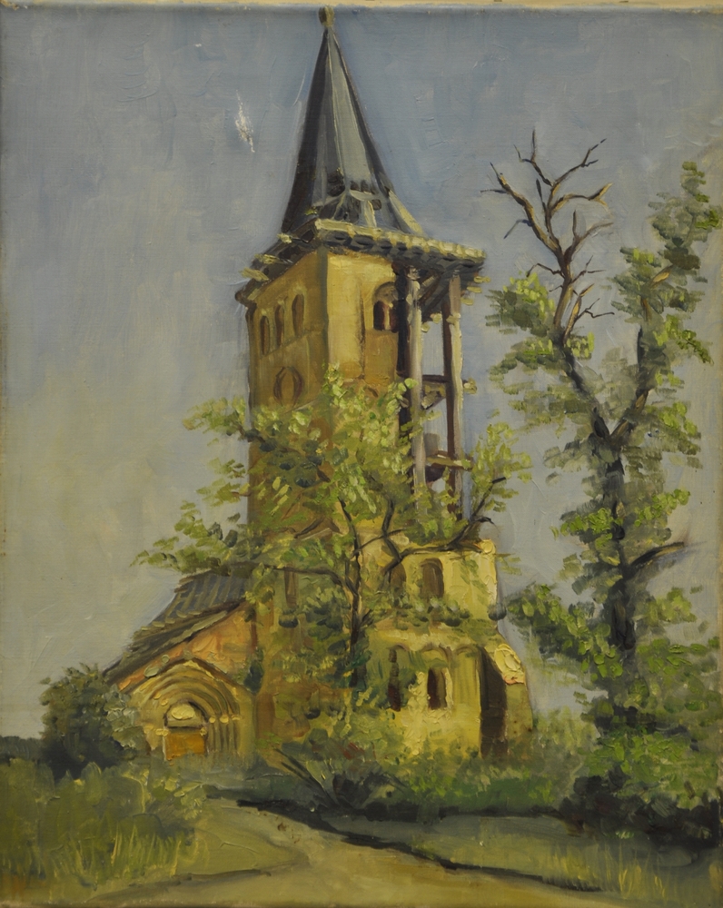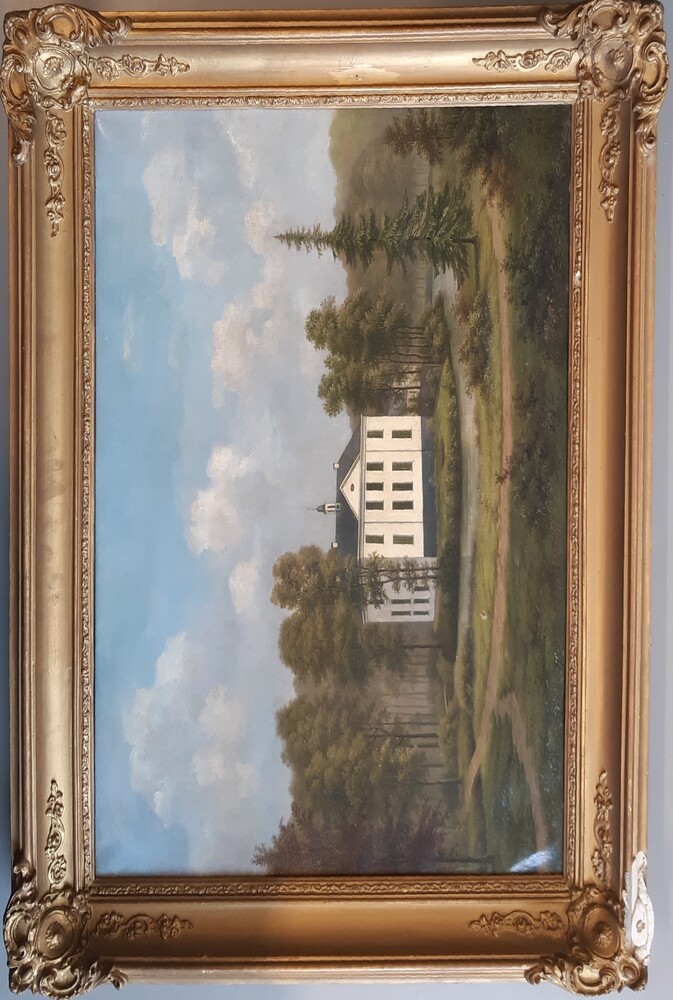 Schilderij verf op doek voorstellend een kerkgebouw ...