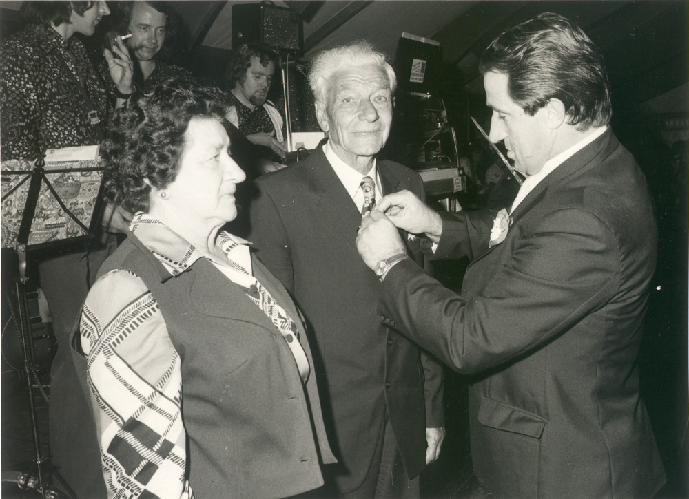 Zwart-wit foto van het uitreiken van een onderscheid...