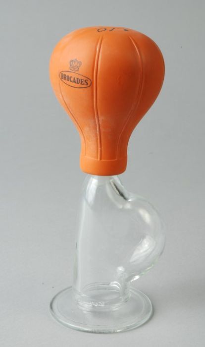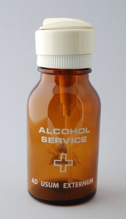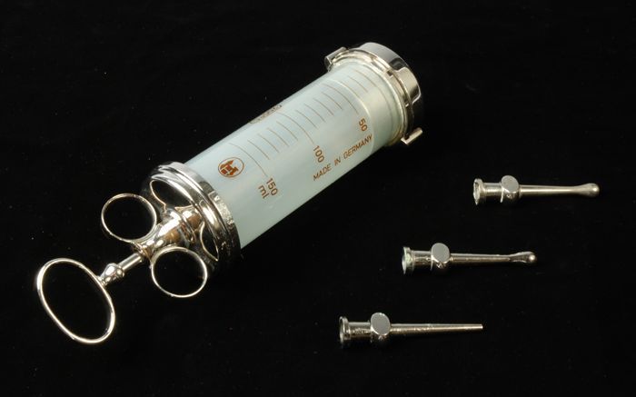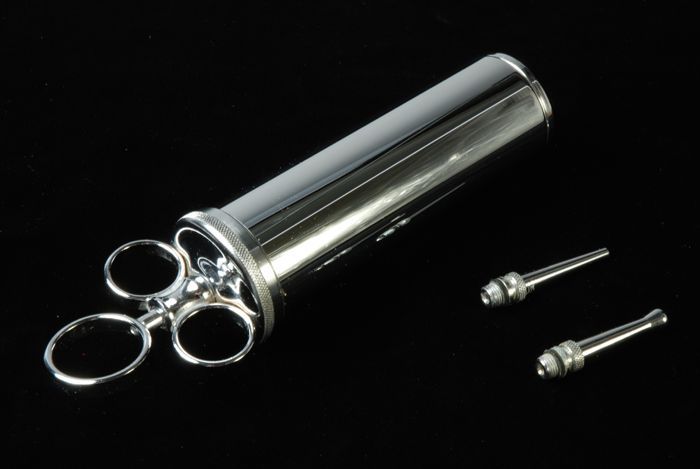 Metalen oorspuit bestaande uit reservoir (A) met maa...