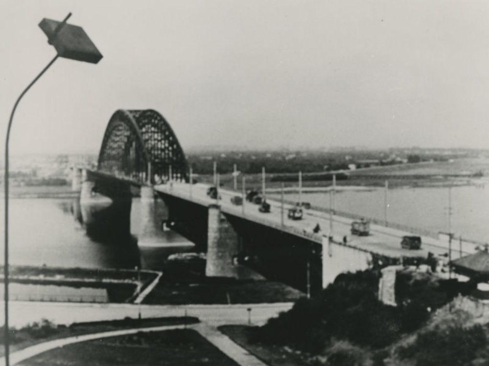 Foto van Waalbrug te Nijmegen met militair verkeer.