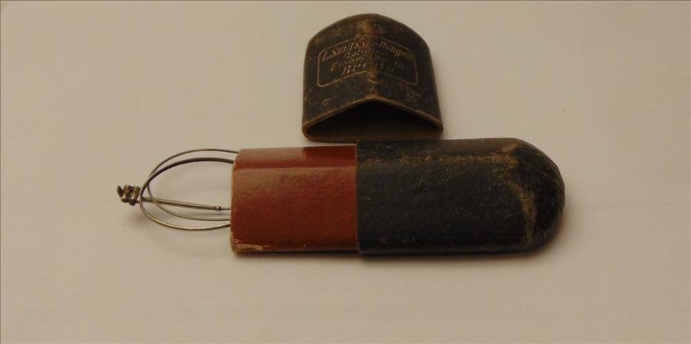 etui met daarin een bril van metaal zonder glas