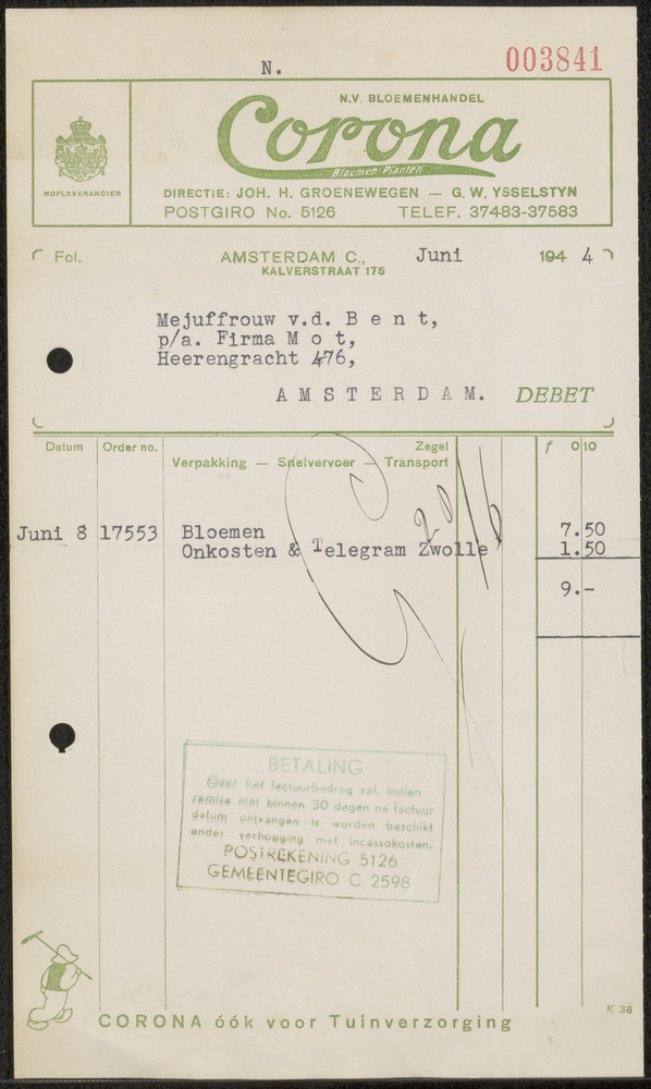 Brief in enveloppe. 25 november 1943. Aan den heer G...