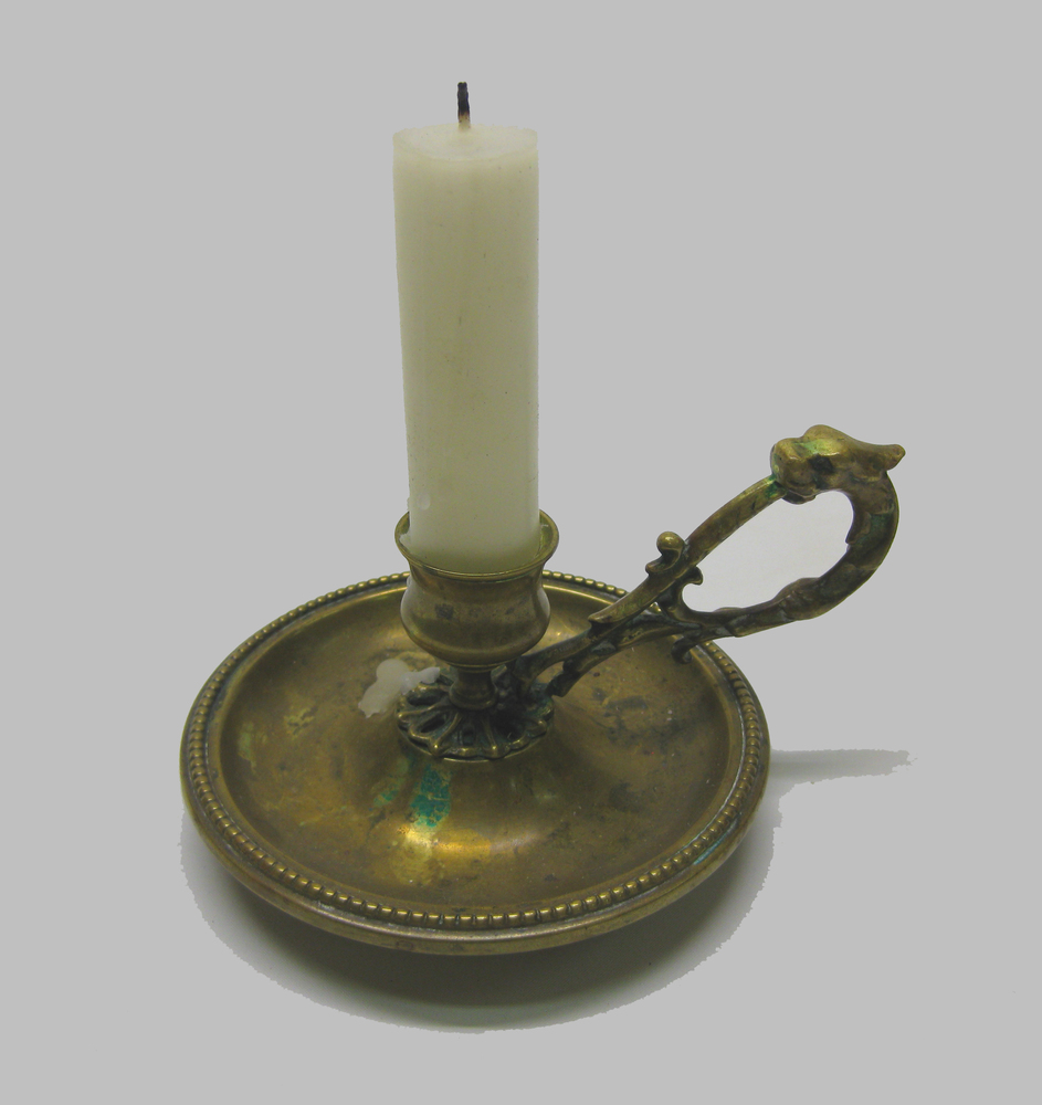 Kandelaar, een blaker van brons en messing uit circa...