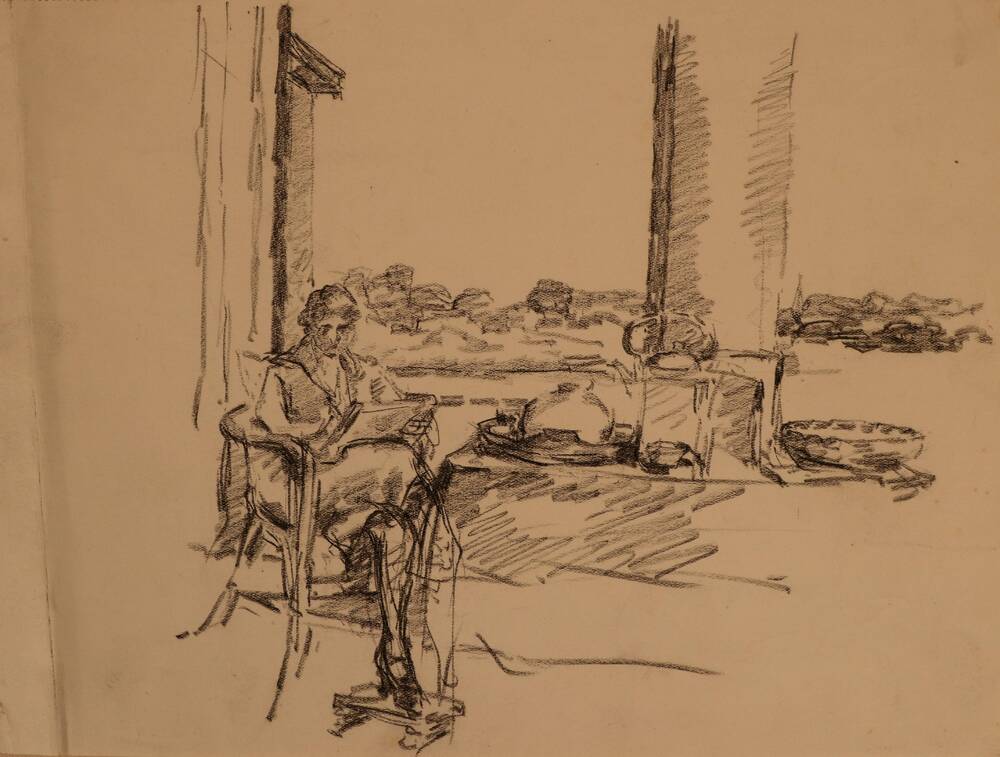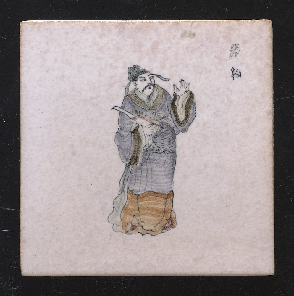 Tegel in chanoir-techniek, met voorstelling: Zittend...