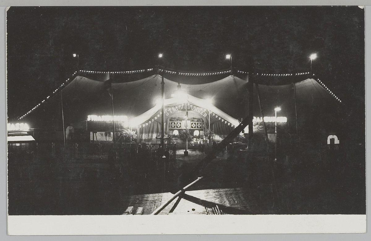 Circustent bij avond, met verlichting. Zweden 1927
