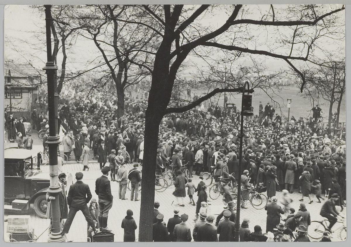 Mensenmassa bij optocht Circus Strassburger, 1928. L...