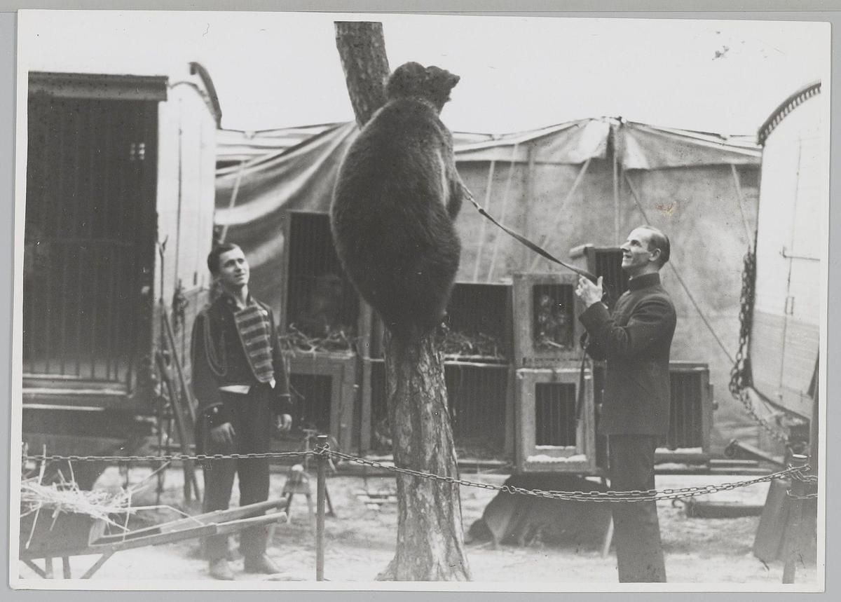 Dresseur met beer die in een boom klimt. Circus Stra...