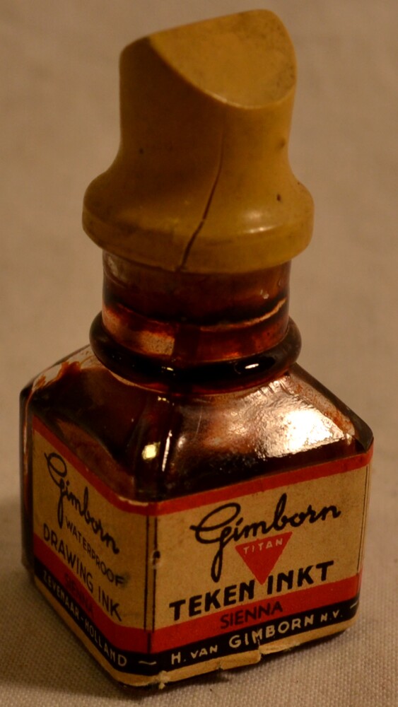 Inktfles van glas gevuld met Siena tekeninkt door H....