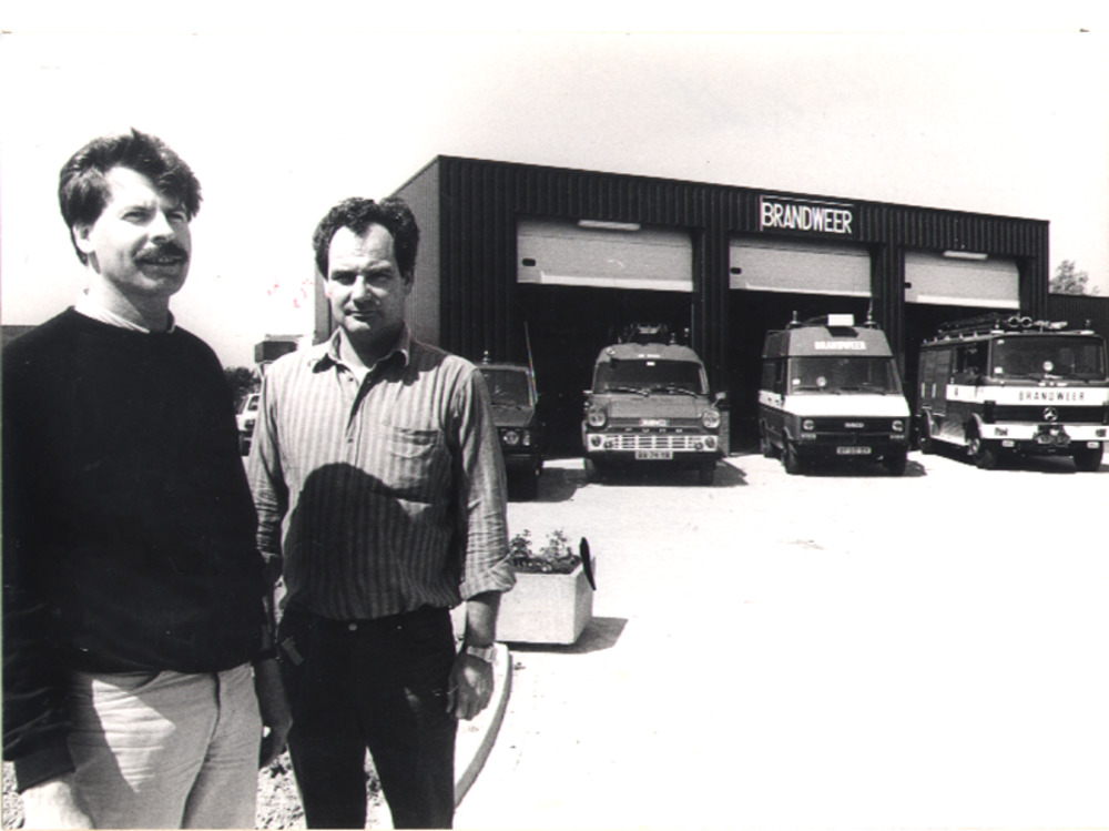 Zwart-wit foto van de brandweerkazerne in Lobith doo...
