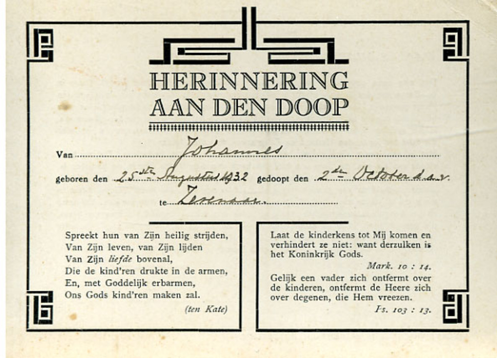 Kaart van papier 'Herinnering aan den doop van Johan...