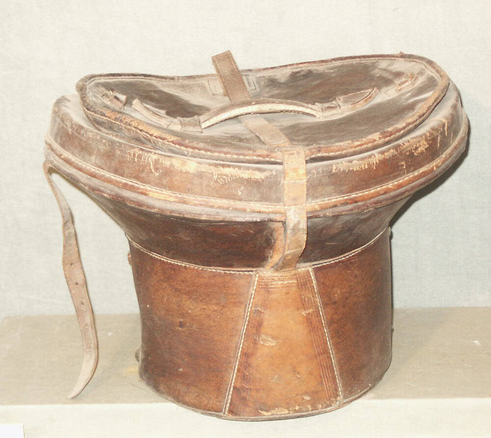 hoedendoos van leer voor hoge hoed, eind 19e eeuw