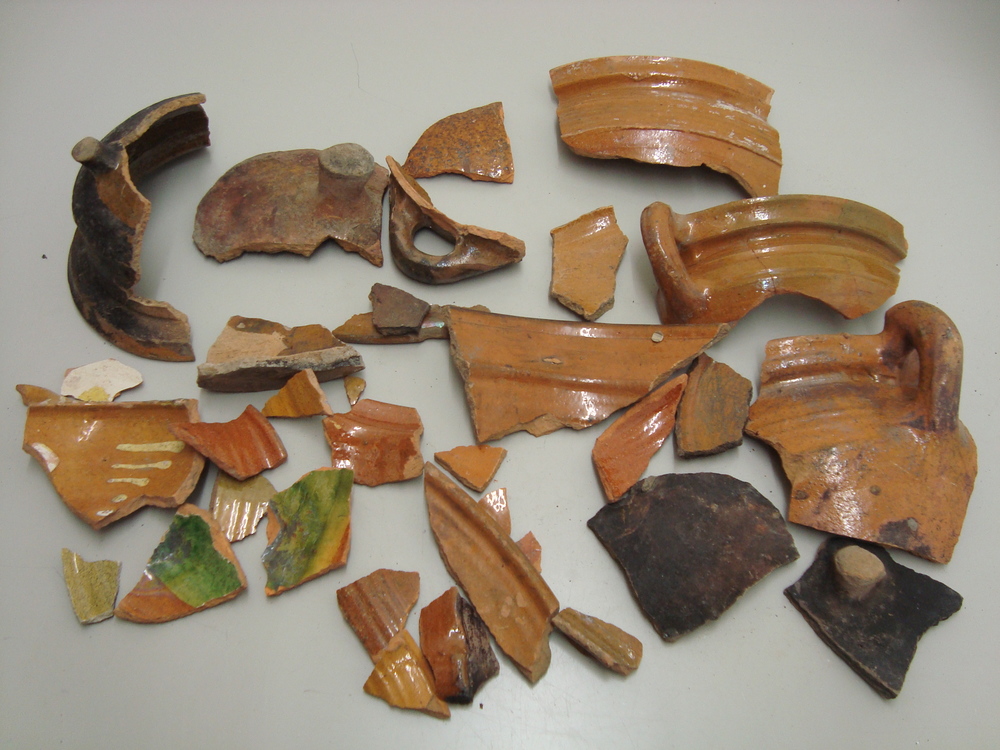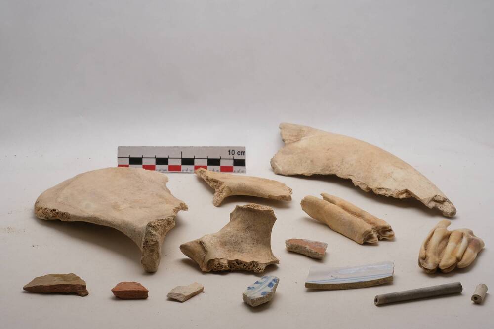 Fragmenten, grond/aardewerk/leer/been/ijzer/steen,