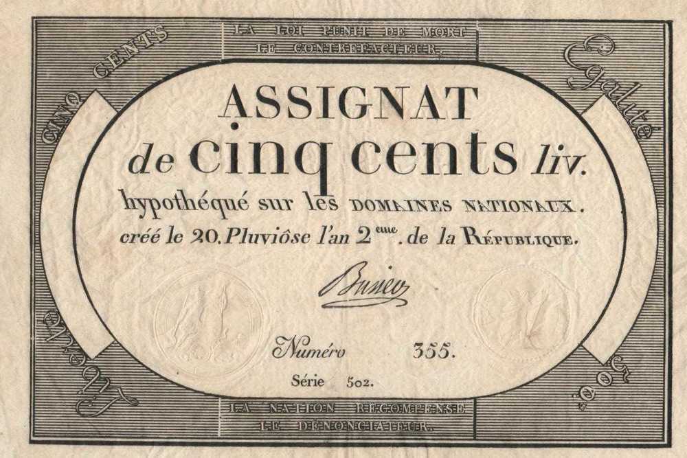 Assignat de cinq cents livres. Dun papier door de Fr...