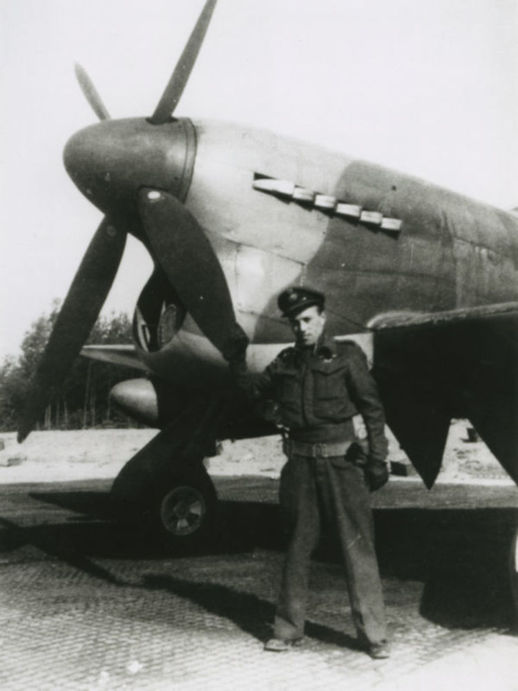 Foto van Britse militair in RAF uniform bij neus Haw...