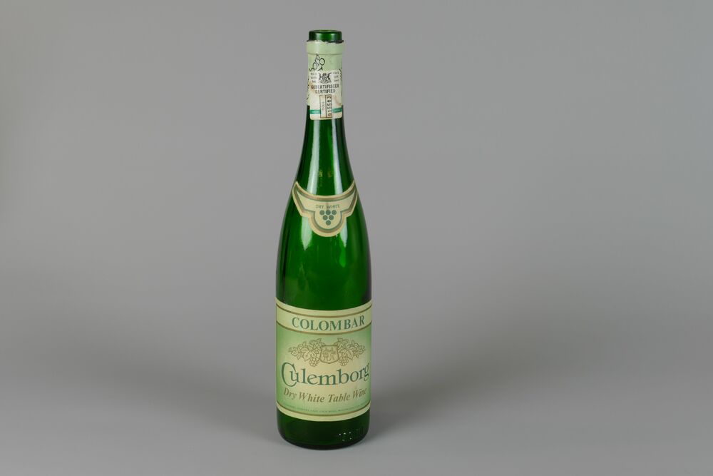 Fles van groen glas met kurk en etiket.
